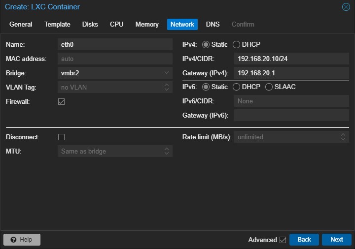 - statyczny adres 192.168.20.10/24 i karta sieciowa eth0 przypięta do mostka sieciowego vmbr2 na Proxmoxie wskazującego na sieć 192.168.20.0/24. Więcej o konfiguracji sieci w Proxmox i dlaczego jest tutaj mostek vmbr2 można przeczytać na stronie https://itadmin.vblog.ovh/proxmox-konfiguracja-i-podzial-sieci/