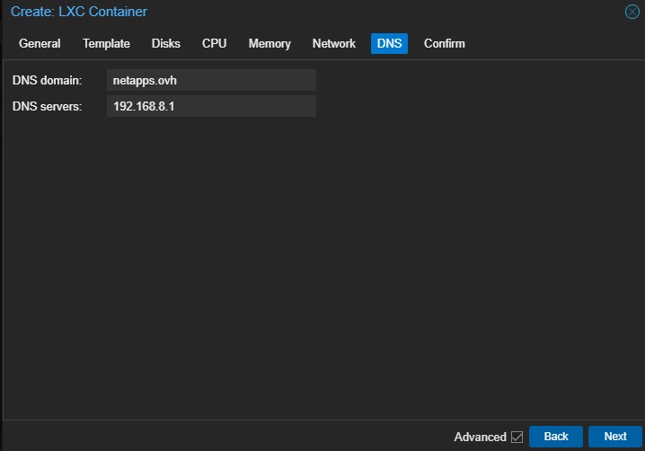 Więcej informacji o tworzeniu kontenerów LXC z użyciem szablonów można znaleźć na stronie https://itadmin.vblog.ovh/proxmox-ve-zarzadzanie-kontenerami-lxc/. Na podstawie szablonu debian-11-standard_11.6-1_amd64 utworzony został kontener LXC o następujących parametrach:
