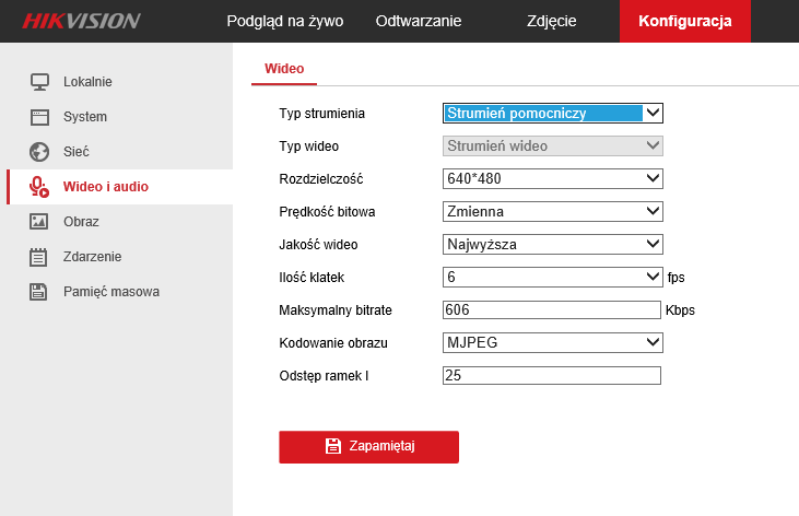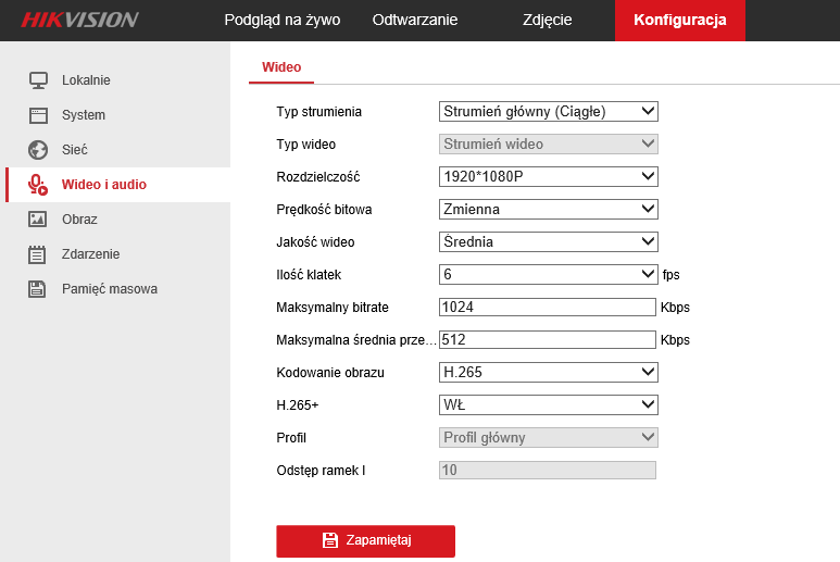 Ustawienia strumienia kamery Hikvision DS-2CD1043G0-I