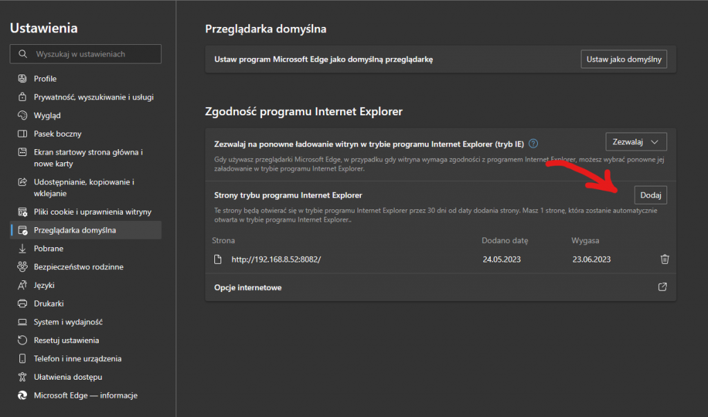Jeśli nie możemy wejść na stronę konfiguracji kamery Hikvision z poziomu Chrome / Firefox / Edge to należy w przeglądarce Edge wpisać w pasku adresu edge://settings/defaultbrowser i dodać stronę kamery do pozycji Strony trybu Internet Explorer.
