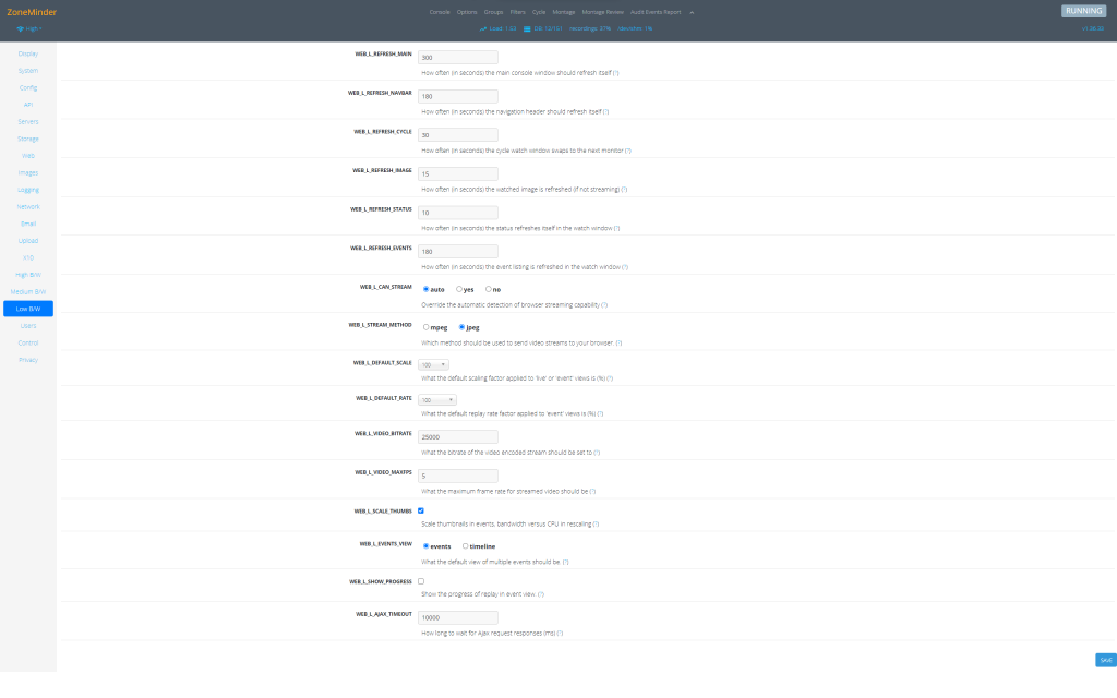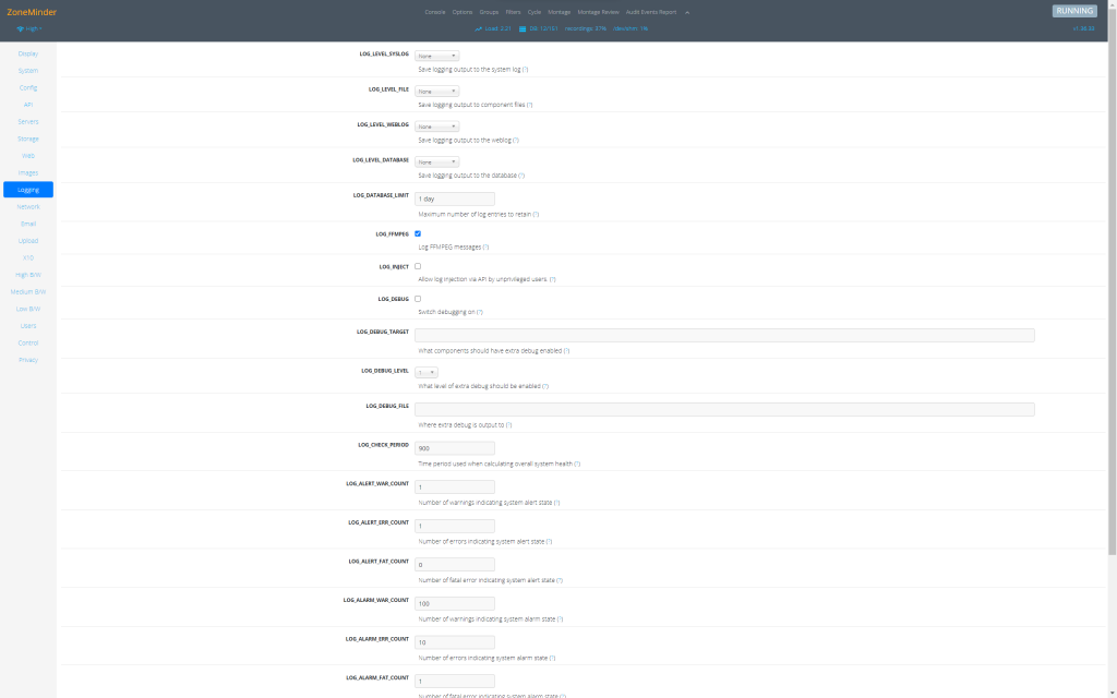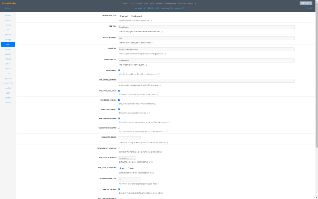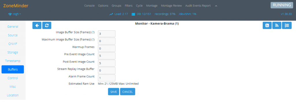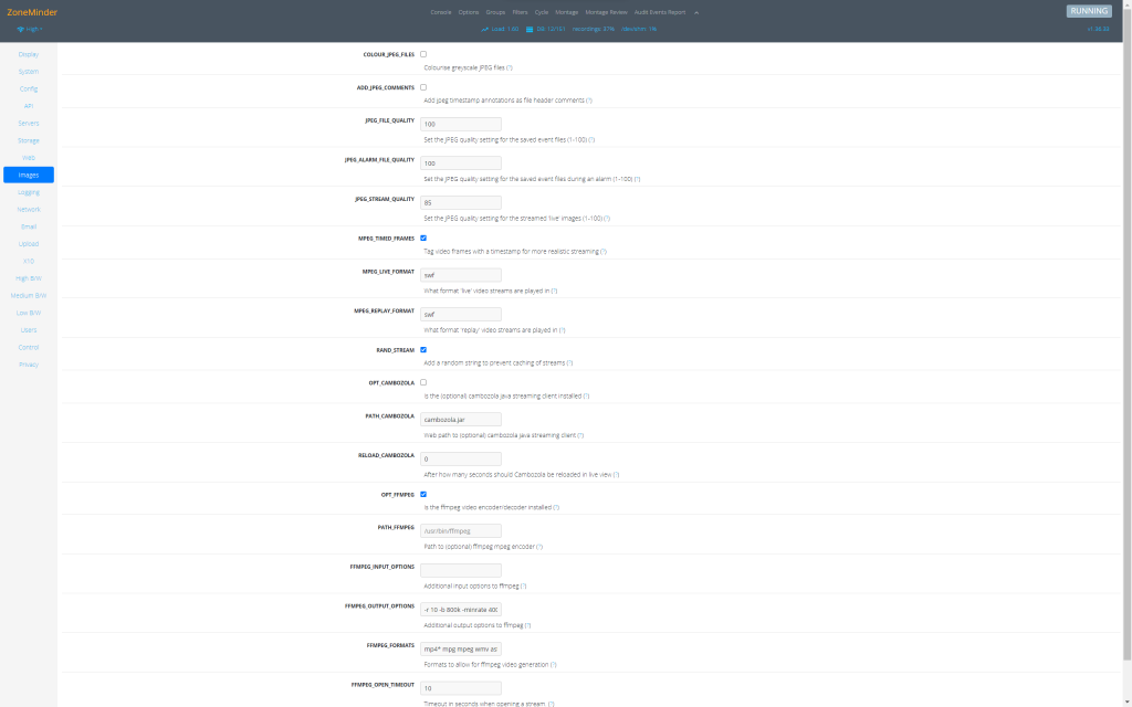 Moja obecna konfiguracja ZoneMinder jest przedstawiona na zrzutach ekranu i można porównać ją z domyślna konfiguracją ZoneMinder u siebie. Ustawiona jest pod ciągłe nagrywanie w plikach mp4 jak najdłuższego czasowo okna.