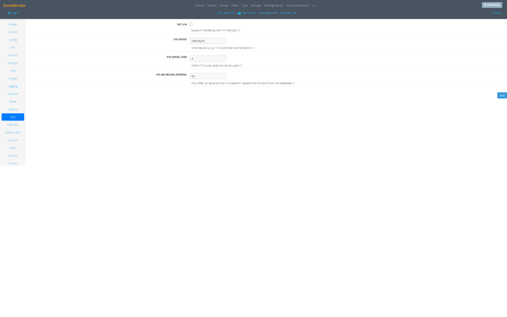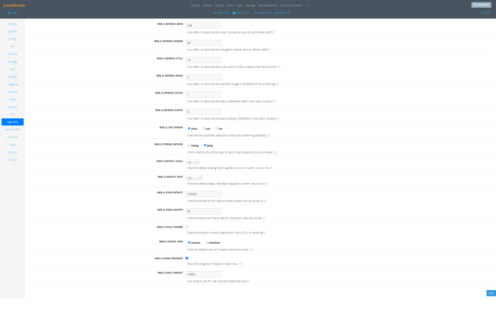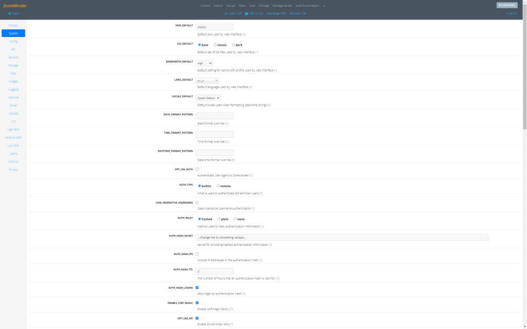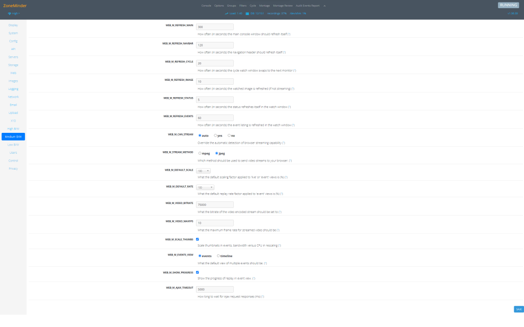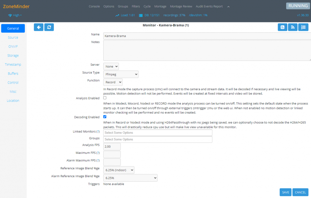 Moja obecna konfiguracja ZoneMinder jest przedstawiona na zrzutach ekranu i można porównać ją z domyślna konfiguracją ZoneMinder u siebie. Ustawiona jest pod ciągłe nagrywanie w plikach mp4 jak najdłuższego czasowo okna.