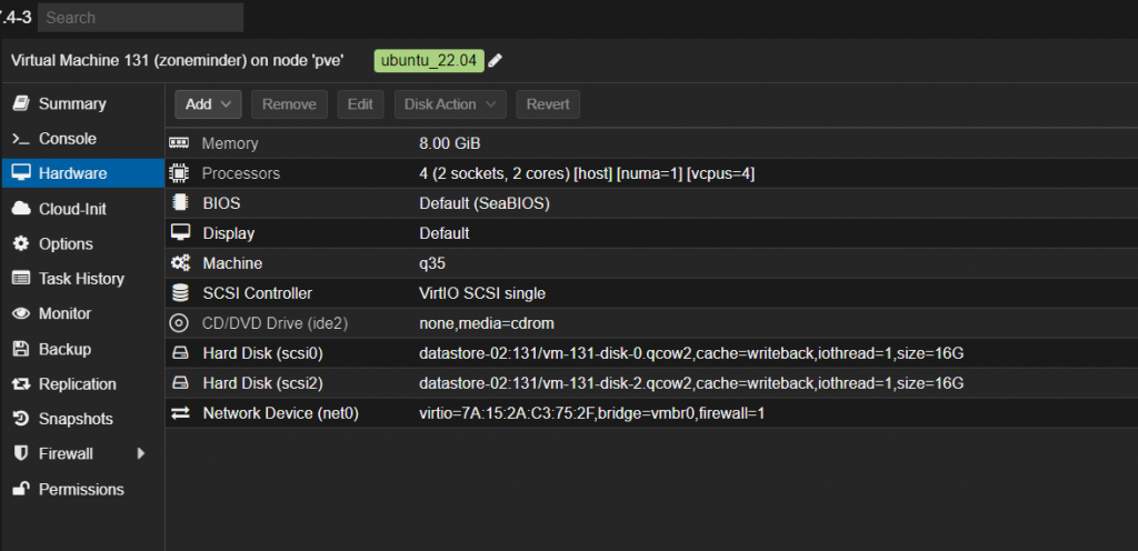 Podstawą ZoneMinder jest maszyna wirtualna z zainstalowanym systemem Ubuntu 22.04 z 4 vCPU / 8 GB RAM / 2 x 16 GB HDD. Konfiguracja jest skrojona pod 4 kamery Hikvision i ciągły zapis z kodowaniem do H.264 przez ZoneMinder. Pierwszy dysk jest zamontowany jako / (EXT4) a drugi jako /var (EXT4) i przeznaczony głównie na logi oraz swapa. W trakcie instalacji ustawiono statyczny adres ip maszyny oraz wybrano instalację z dodatkowego oprogramowania tylko serwer SSH.