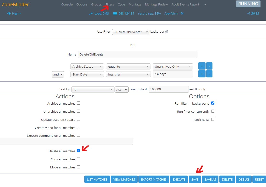 Wchodzimy w menu Filters i dodajemy nowy filtr z odpowiednimi opcjami jak poniżej. Więcej informacji o filtrach zoneminder można znaleźć na tej stronie https://wiki.zoneminder.com/Filters oraz https://zoneminder.readthedocs.io/en/stable/userguide/filterevents.html