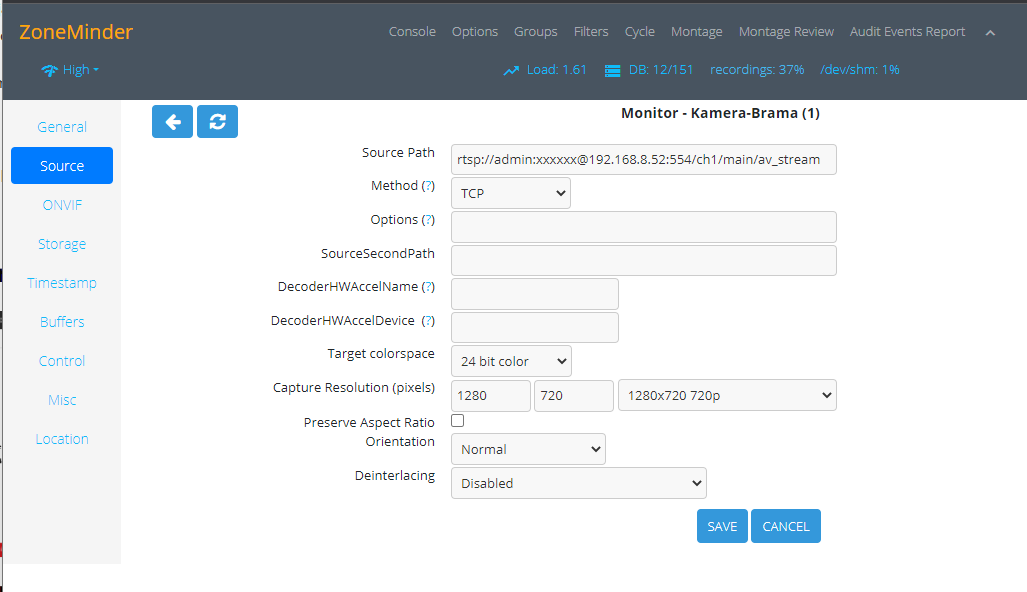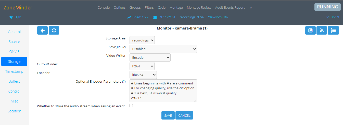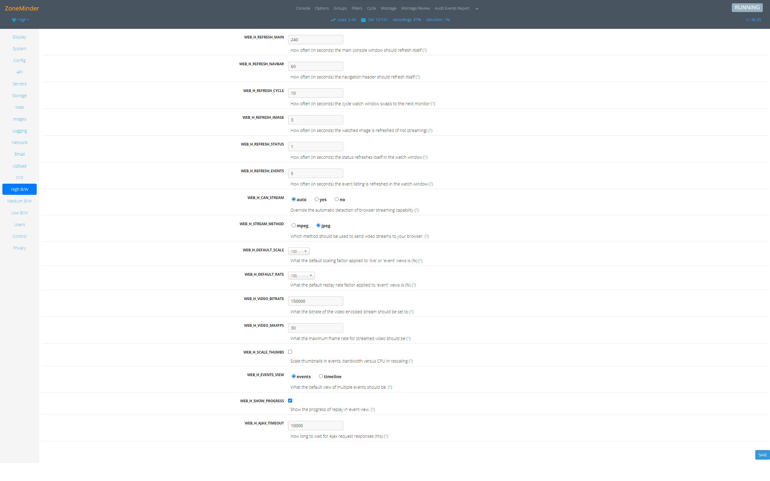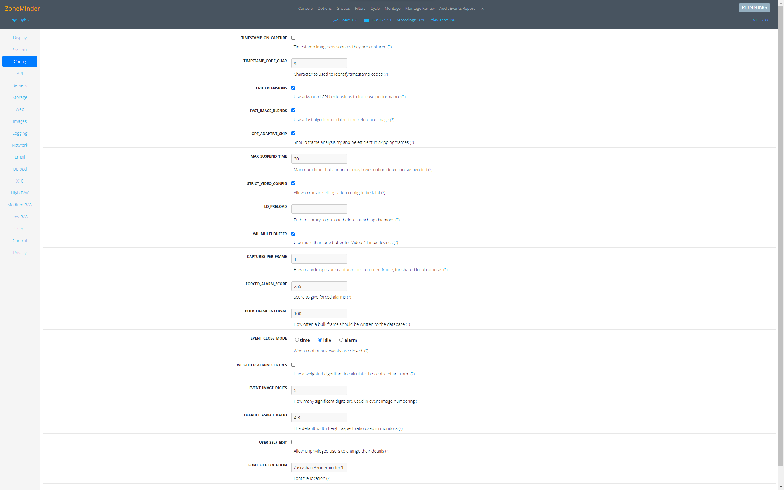 Moja obecna konfiguracja ZoneMinder jest przedstawiona na zrzutach ekranu i można porównać ją z domyślna konfiguracją ZoneMinder u siebie. Ustawiona jest pod ciągłe nagrywanie w plikach mp4 jak najdłuższego czasowo okna.