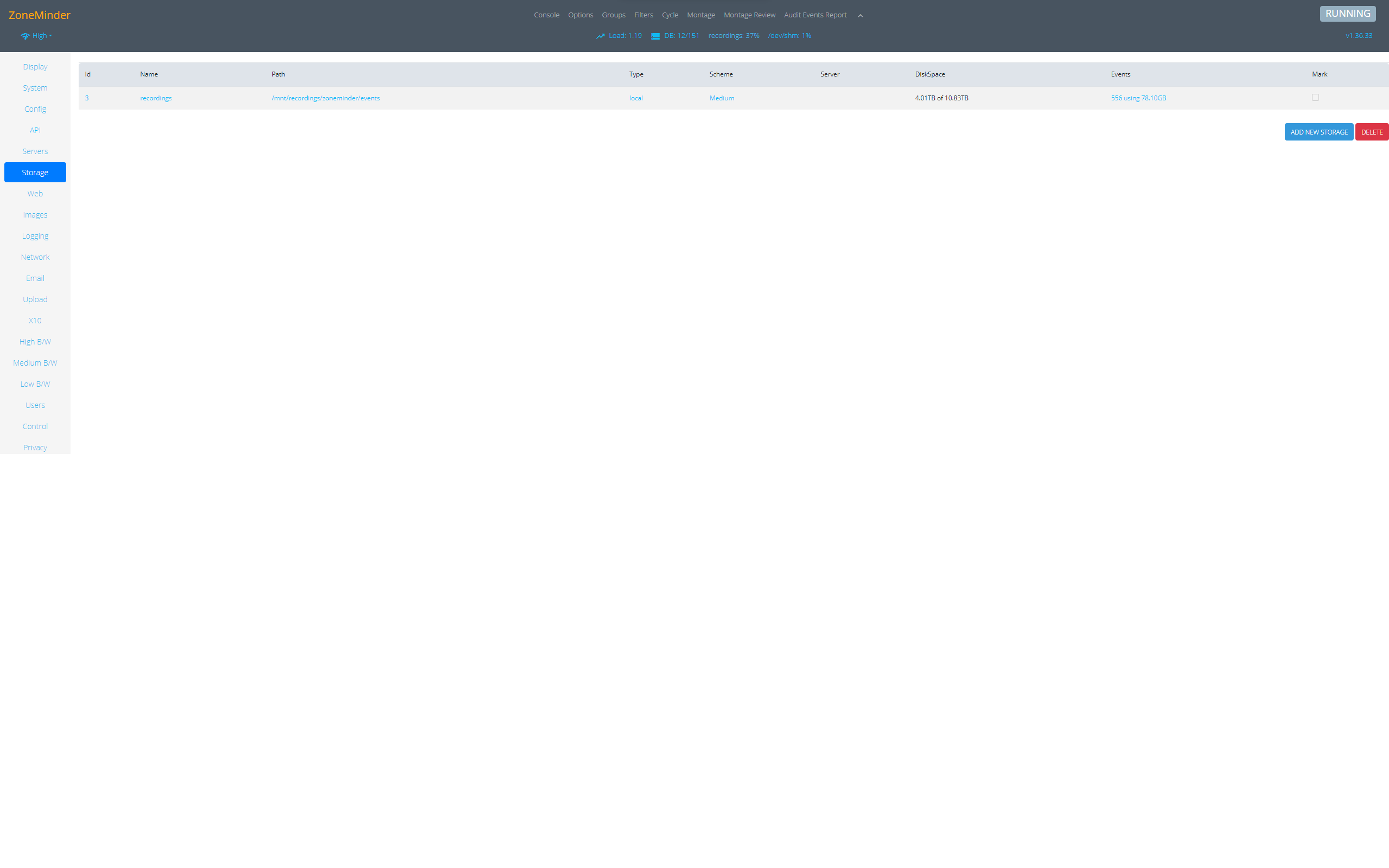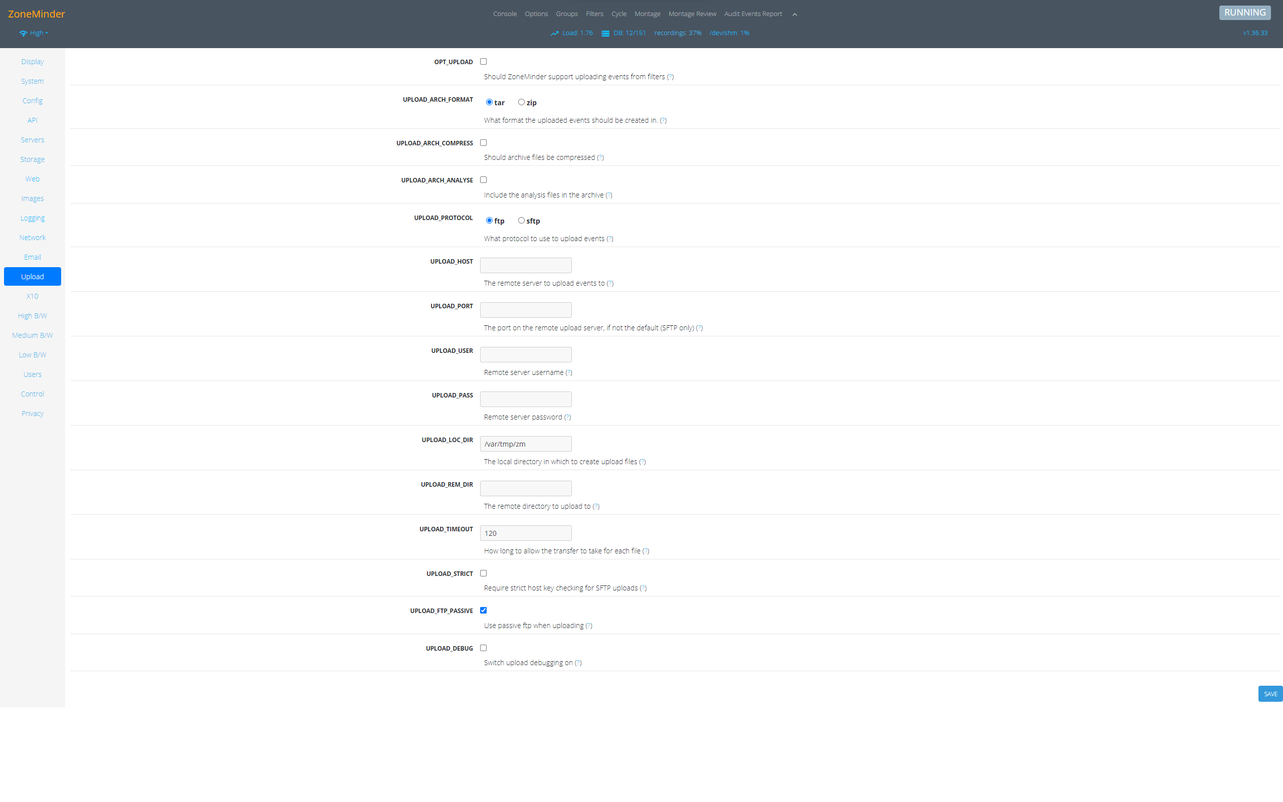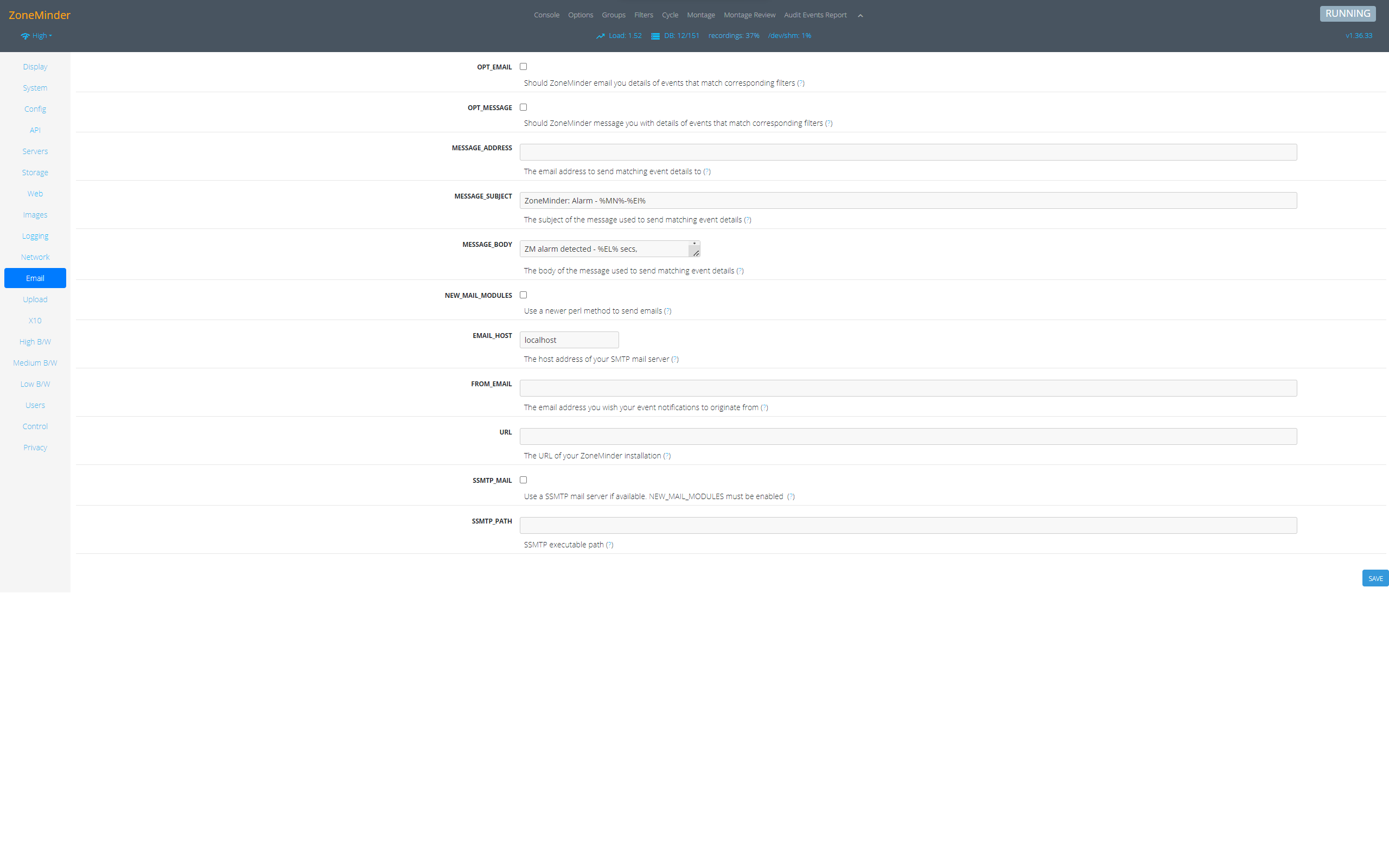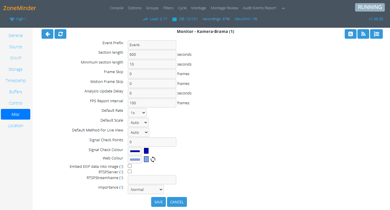 Moja obecna konfiguracja ZoneMinder jest przedstawiona na zrzutach ekranu i można porównać ją z domyślna konfiguracją ZoneMinder u siebie. Ustawiona jest pod ciągłe nagrywanie w plikach mp4 jak najdłuższego czasowo okna.