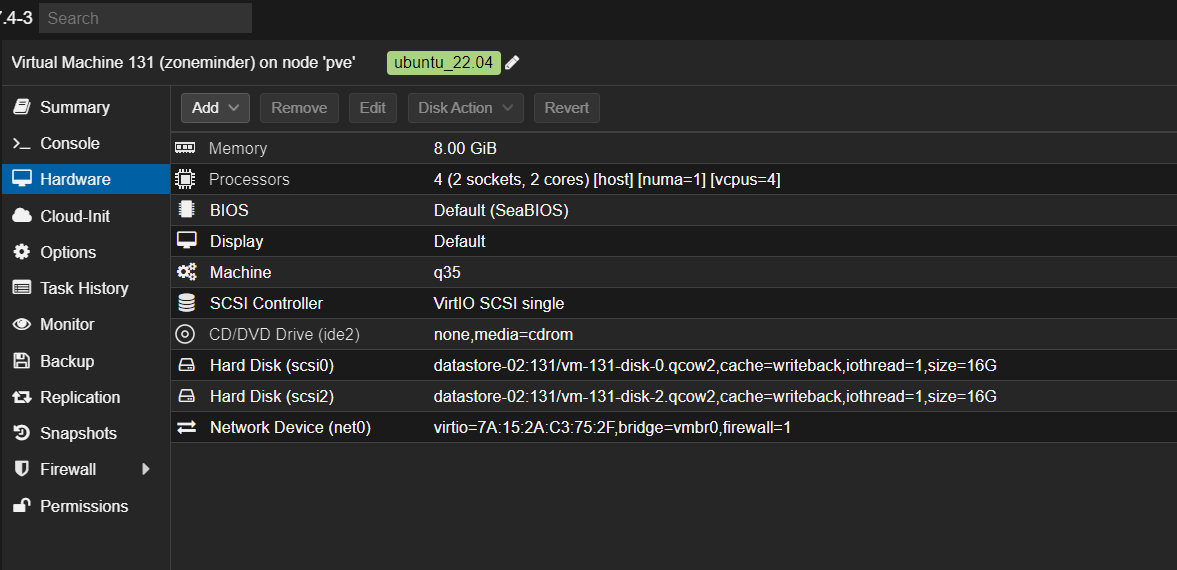 Podstawą ZoneMinder jest maszyna wirtualna z zainstalowanym systemem Ubuntu 22.04 z 4 vCPU / 8 GB RAM / 2 x 16 GB HDD. Konfiguracja jest skrojona pod 4 kamery Hikvision i ciągły zapis z kodowaniem do H.264 przez ZoneMinder. Pierwszy dysk jest zamontowany jako / (EXT4) a drugi jako /var (EXT4) i przeznaczony głównie na logi oraz swapa. W trakcie instalacji ustawiono statyczny adres ip maszyny oraz wybrano instalację z dodatkowego oprogramowania tylko serwer SSH.