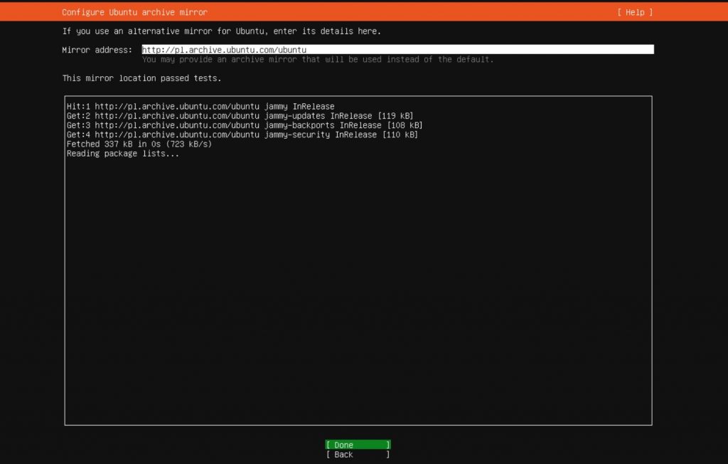 - Potwierdzamy adres serwera skąd pobierane będą pakiety do instalacji w razie potrzeby. W razie problemów z bardzo wolną instalacją np. Installing kernel trwa nieskończenie długo, warto zmienić adres mirror na inny np. zawarty w pliku http://mirrors.ubuntu.com/mirrors.txt http://ubuntu.man.lodz.pl/ubuntu/