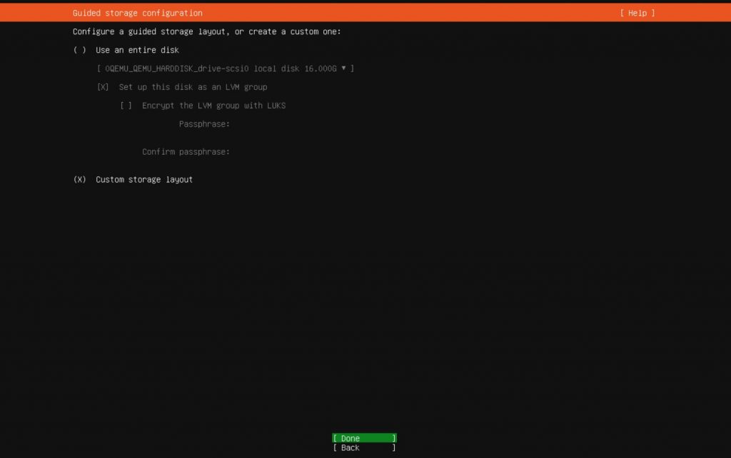 - Wybieramy Custom storage layout aby mieć pełną kontrolę nad podziałem dysku na partycje