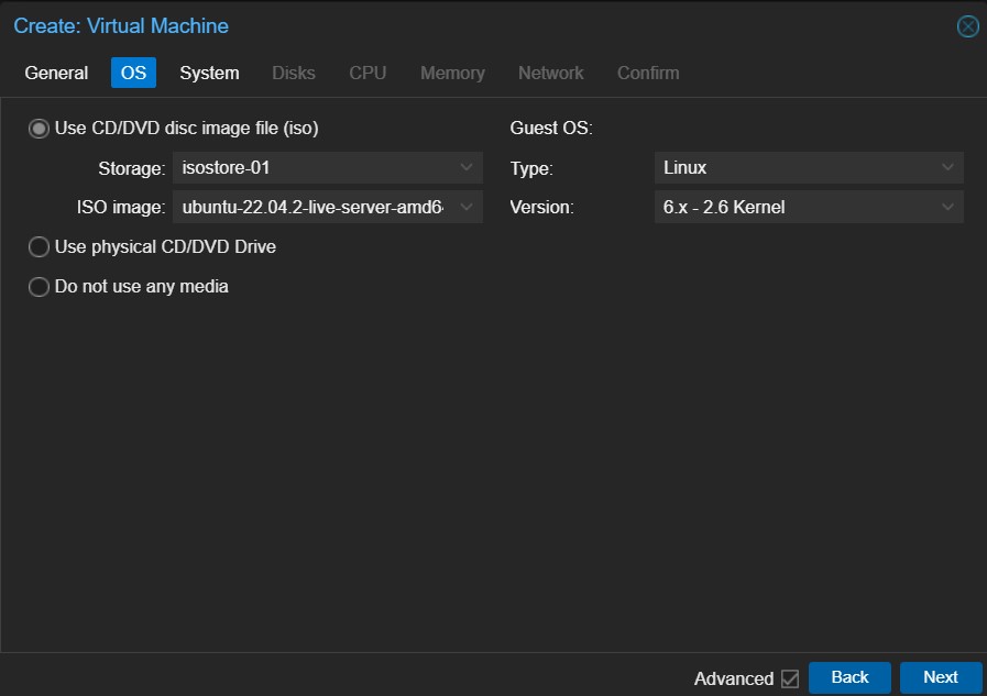 - wskazujemy obraz iso z naszego Storage na Proxmox systemu Ubuntu pobrany ze strony https://ubuntu.com/download/server