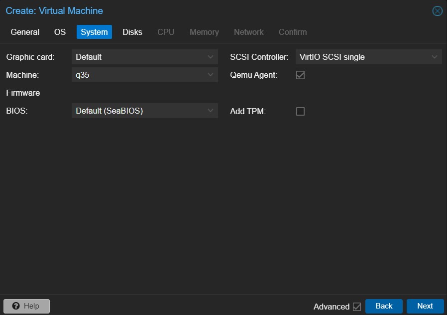 - określamy typ Machine na nowoczesny q35 i zaznaczamy że chcemy mieć komunikację z maszyną przez Qemu Agent