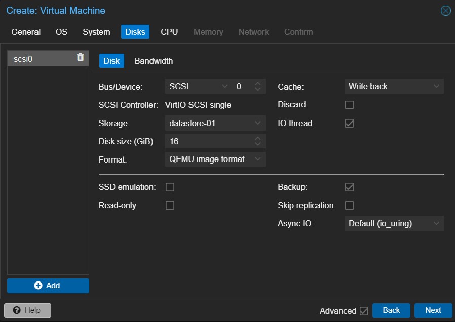 - dodajemy podstawowy dysk dla systemu w rozmiarze np. 8-16 GB, w formacie qcow2 (aby działały snapshoty), z cache w trybie Write back i zaznaczonym IO thread
