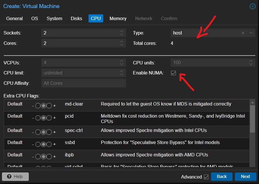 Dobrym pomysłem jest dodanie 2 lub więcej wirtualnych dysków i odseparowanie od siebie partycji /, /var, czy /home - ustawiamy min. 2 Sockets i 1-2 Cores w zależności od potrzeb oraz wybieramy Type: host i zaznaczamy Enable NUMA https://pve.proxmox.com/wiki/NUMA