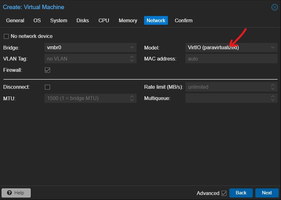 - wybieramy najszybszy model karty sieciowej VirtIO