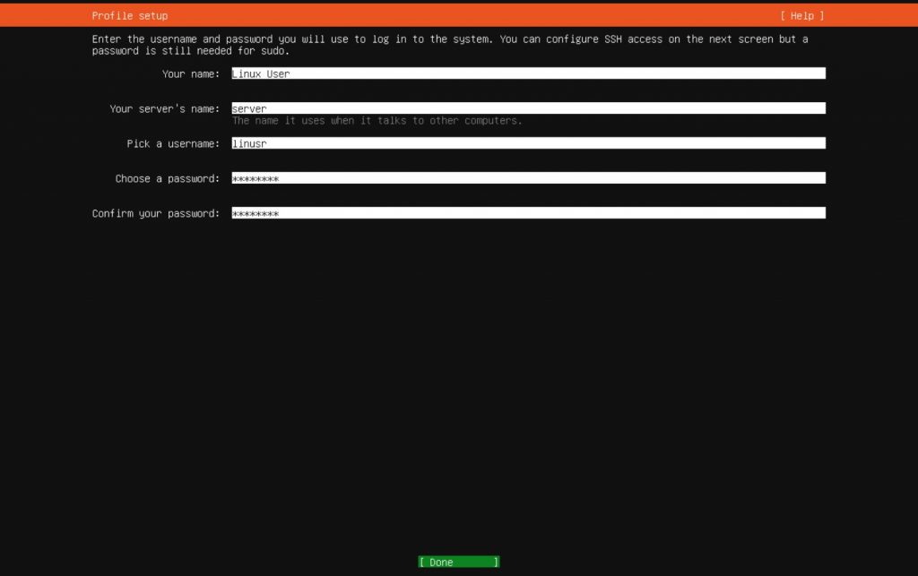 - Podajemy nazwę serwera oraz nazwę i hasło pierwszego użytkownika systemowego z którego będziemy się logować później na root-a