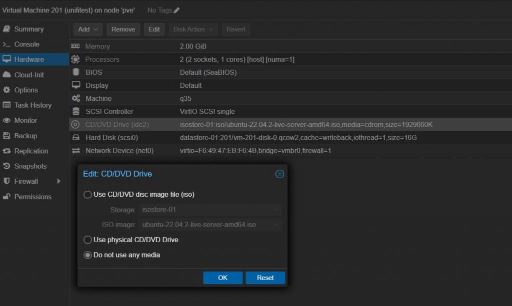 - Po skończonej instalacji zanim potwierdzimy Reboot Now dobrze jest usunąć z menu maszyny wirtualnej Proxmox Hardware – CD/DVD ISO z systemem ubuntu