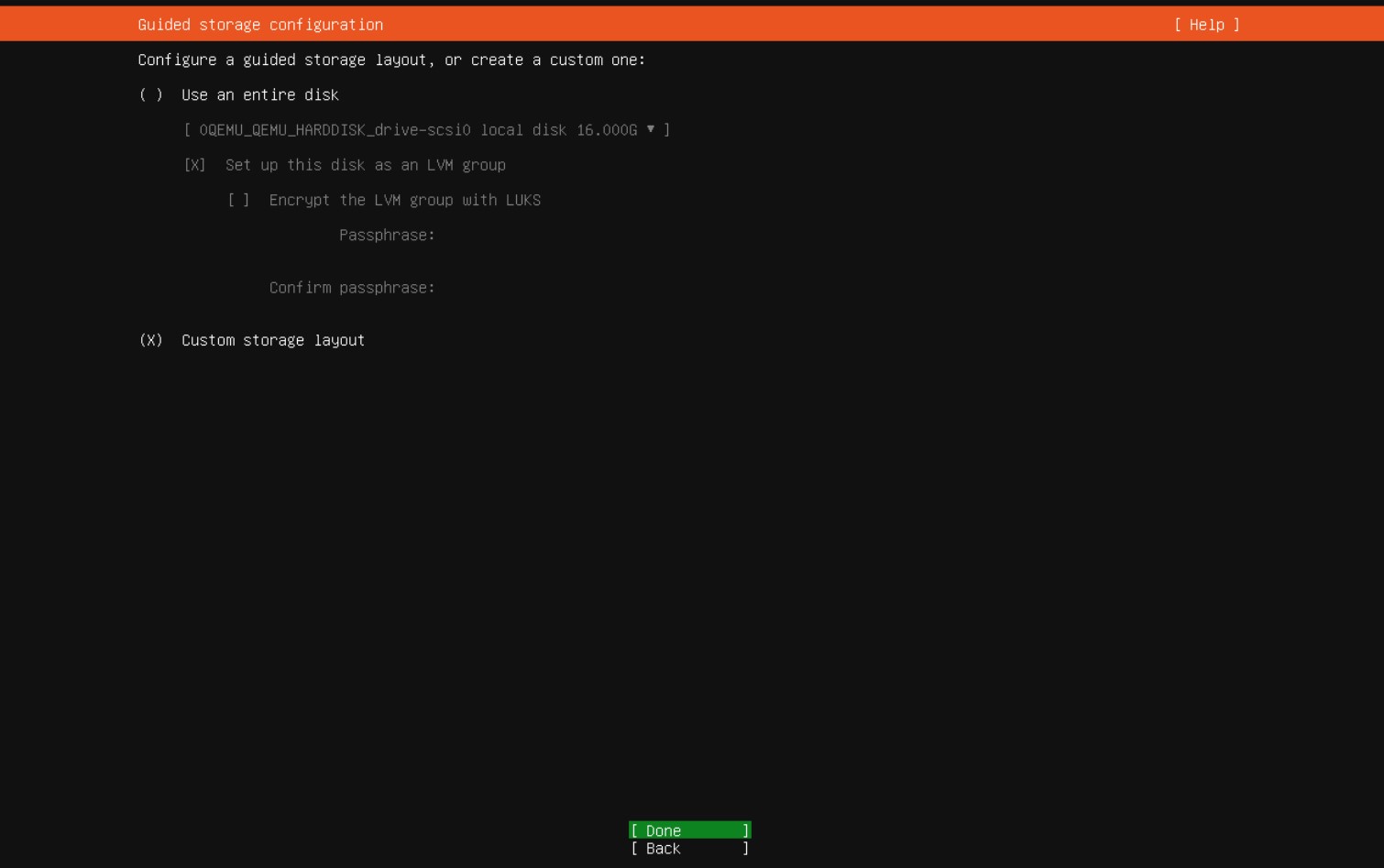 - Wybieramy Custom storage layout aby mieć pełną kontrolę nad podziałem dysku na partycje
