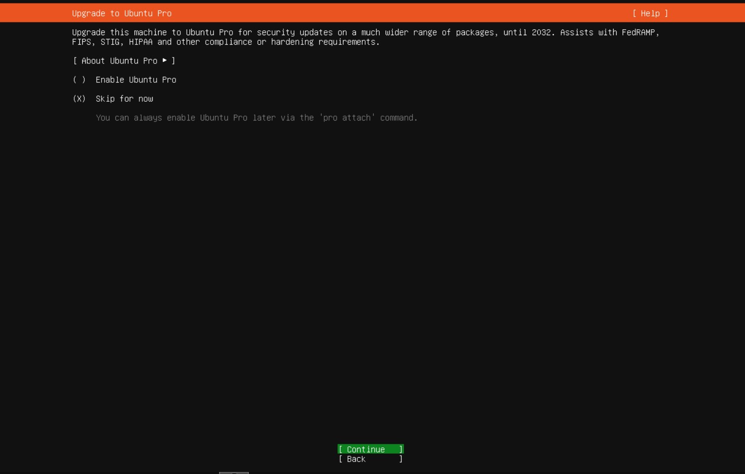 - Pomijamy dodanie do usługi Ubuntu Pro. (Pierwsze 5 maszyn jest bezpłatnie, wydłuża czas wsparcia systemu z 5 do 10 lat) https://ubuntu.com/pro