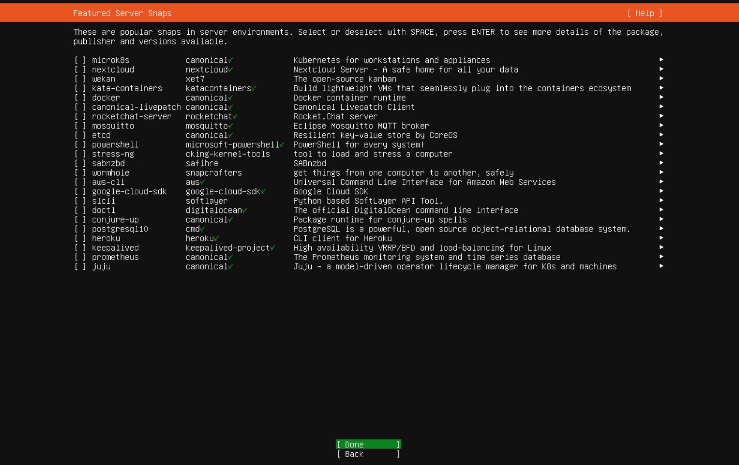 - Nie wybieramy żadnego dodatkowego oprogramowania Snap do instalacji