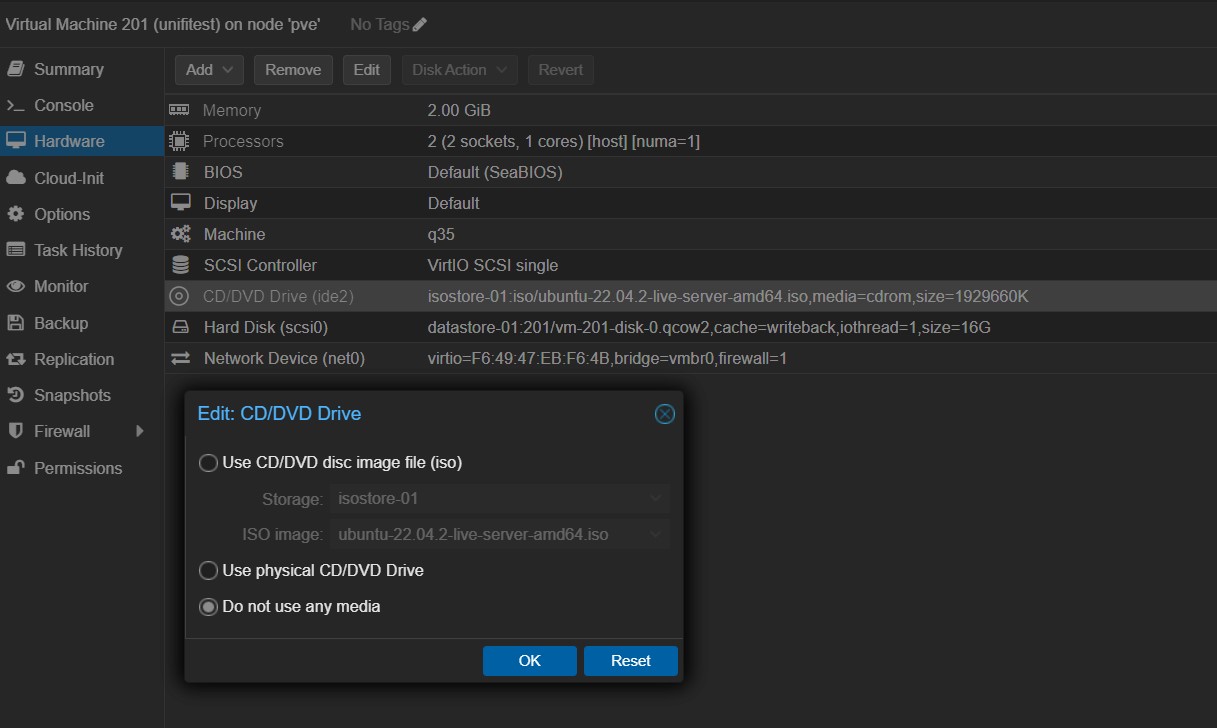 - Po skończonej instalacji zanim potwierdzimy Reboot Now dobrze jest usunąć z menu maszyny wirtualnej Proxmox Hardware – CD/DVD ISO z systemem ubuntu