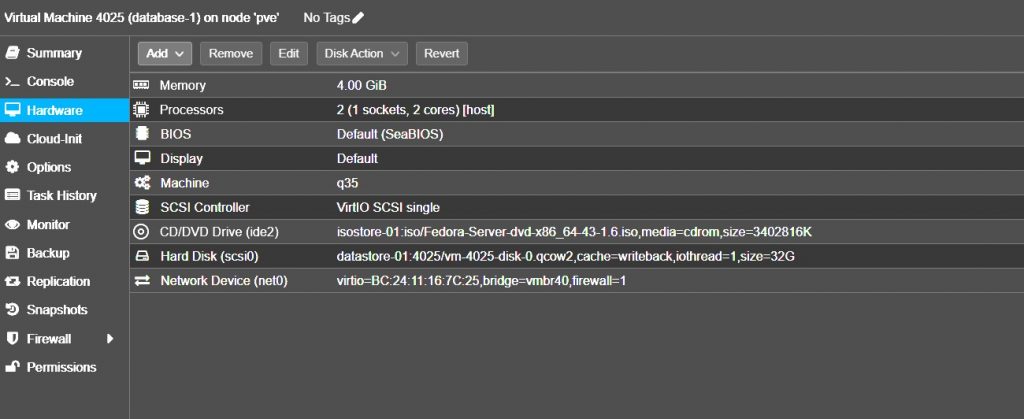 Przygotowanie maszyny wirtualnej database-1 (4025) w Proxmox 9 GUI