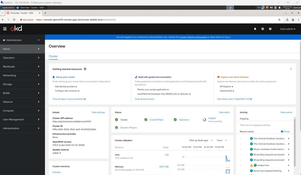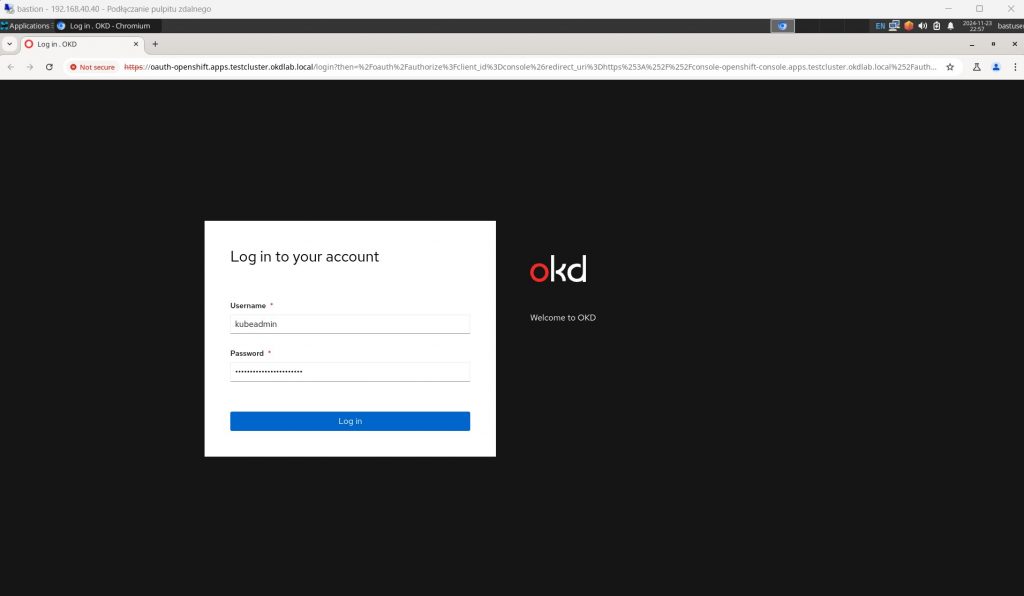 Po skończonej instalacji klastra można zalogować się do konsolui GUI klastra OKD (OpenShift) pod adresem https://console-openshift-console.apps.testcluster.okdlab.local