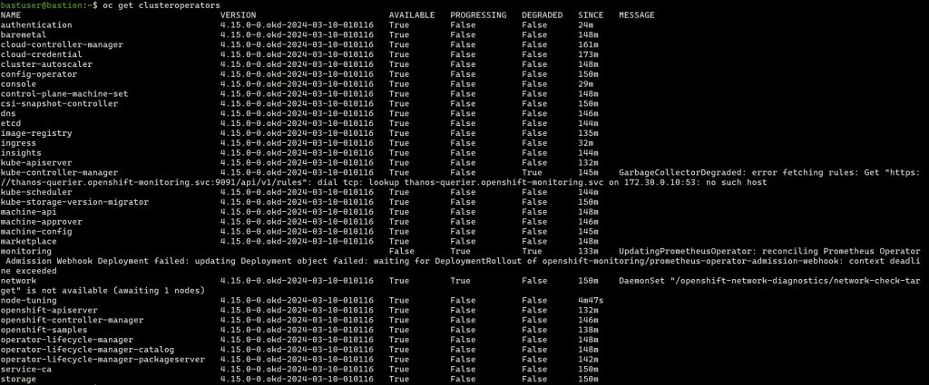 Również ważne jest aby wszystkie wymagane funkcjonalności klastra były dostępne co może wymagać ok 1 godziny czasu (Available = True z wyjątkiem funkcjonalności metryk, która zostanie włączona osobno)