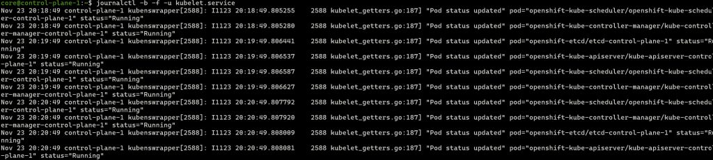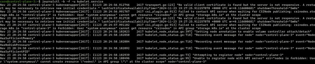 # na maszynie bastion ssh -i /home/bastuser/.ssh/id_ed25519 [email protected] ssh -i /home/bastuser/.ssh/id_ed25519 [email protected] ssh -i /home/bastuser/.ssh/id_ed25519 [email protected] # na dowolnym control-plane journalctl -b -f -u kubelet.service