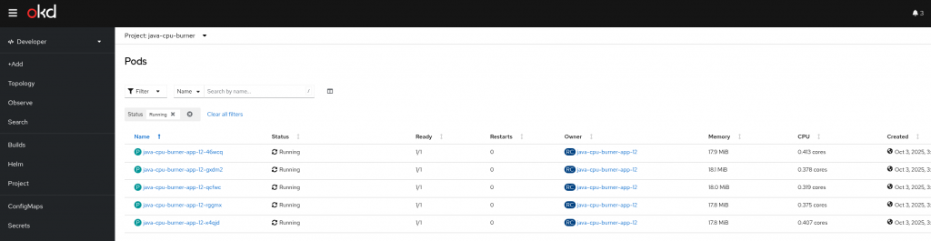 deploymentconfig.apps.openshift.io/java-cpu-burner-app 15 2 2 config,image(java-cpu-burner-build:latest)