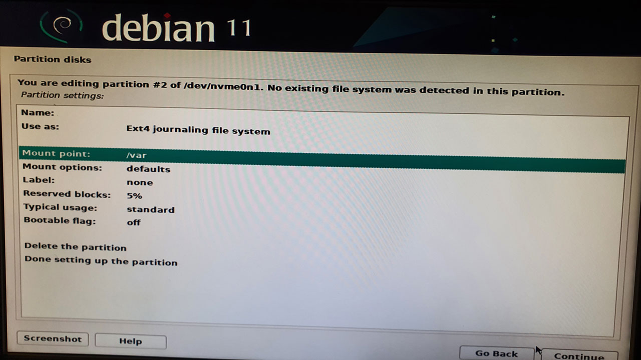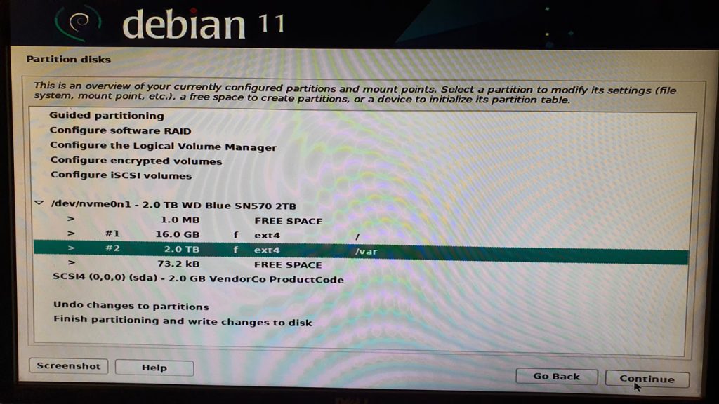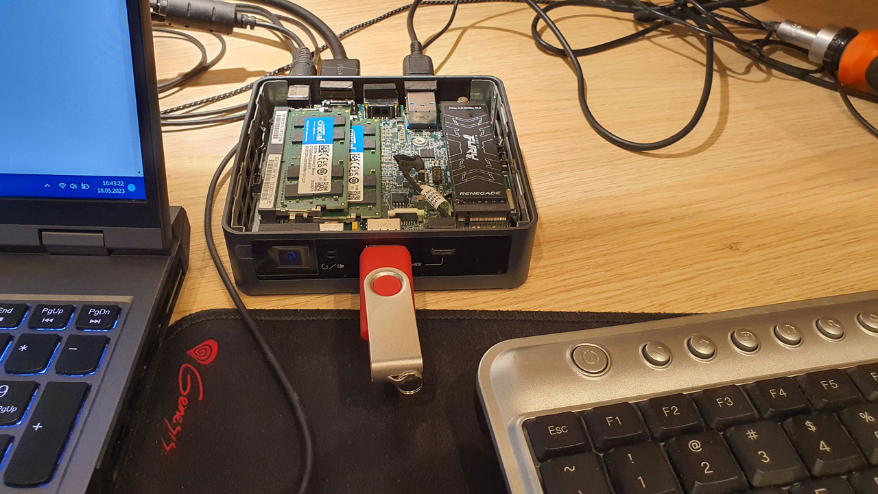 Przed rozpoczęciem instalacji dobrze jest ustawić zalecane ustawienia BIOS-u szczególnie opcję Legacy Boot. Uruchamiamy Intel NUC, wciskamy F10 i botujemy system z pendrive. W tym przypadku ponieważ głównym i jedynym dyskiem wewnętrznym czyli najszybszym będzie WD Blue SN 570 NVMe o pojemności 2 TB dobrze jest utworzyć na nim 2 osobne partycje EXT4: