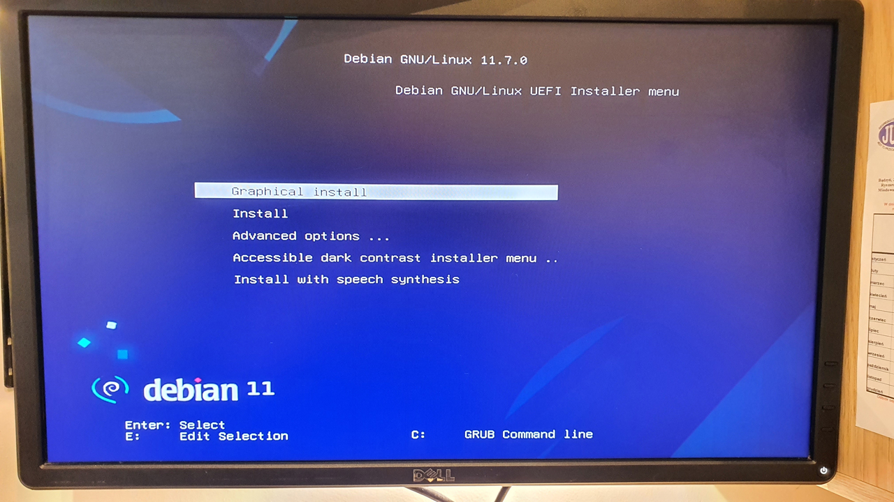 Pobieramy obraz systemu Debian 11 debian-live-11.7.0-amd64-standard.iso ~ 1,2 GB z https://cdimage.debian.org/cdimage/release/current-live/amd64/iso-hybrid/ i nagrywamy przy użyciu programu Rufus na naszego pendrive => 2 GB.