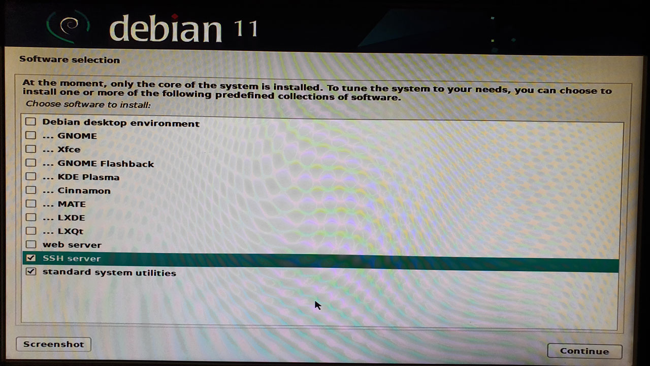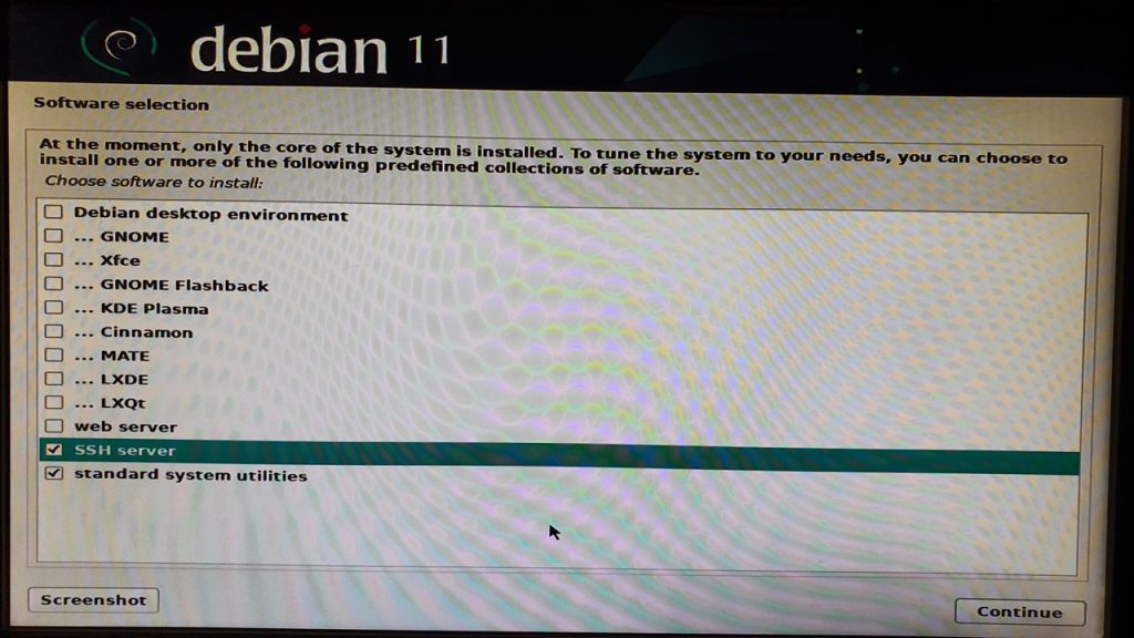 Wybieramy z dodatkowego oprogramowania tylko SSH Server ora standard system utilities.