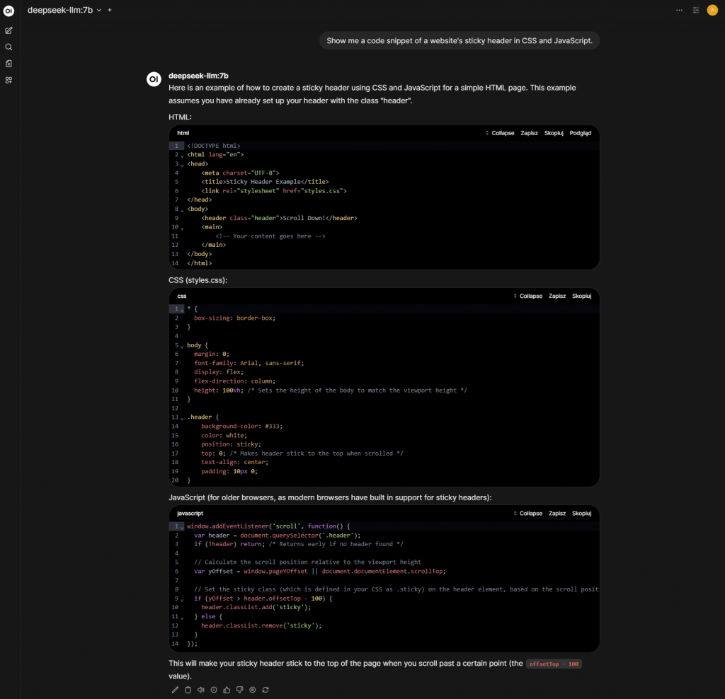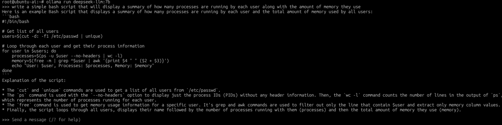 # pobranie uniwersalnego modelu językowego ollama pull deepseek-llm:7b # i jego uruchomienie ollama run deepseek-llm:7b