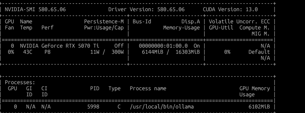 Oct 07 06:46:19 ubuntu-ai ollama[930]: [GIN] 2025/10/07 - 06:46:19 | 200 | 729.3µs | 127.0.0.1 | GET "/api/version"A polecenie nvidia-smi pokazuje prawidłowe informacje diagnostyczne o karcie graficznej to oznacza to, że usługa ollama startuje zbyt wcześnie i należy ją dostosować.