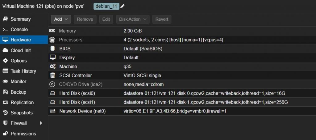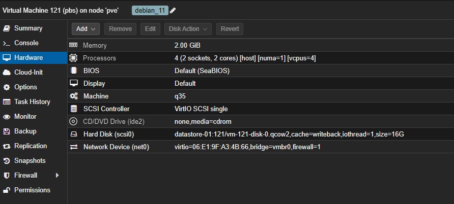 - Konfigurujemy maszynę wirtualną o nazwie pbs, id np. 121 z 4 vCPU / 2 GB RAM / 16 GB HDD