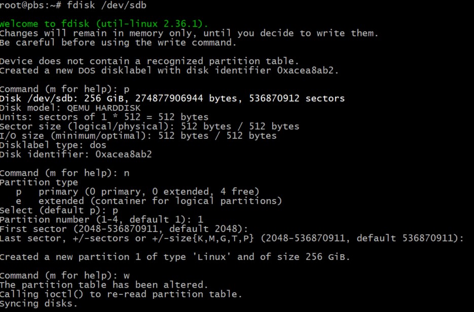 # tworzymy 1 partycję Linux na dysku /dev/sdb (256 GB)