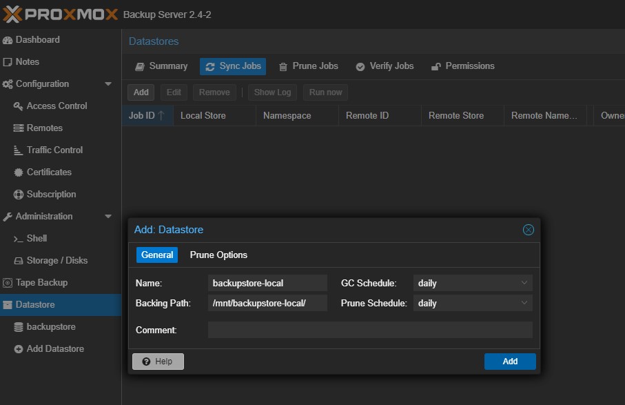 Tworzenie chunkstore może potrwać na dużym dysku sieciowym dość długo i aby uniknąć timeoutów z interfejsu GUI najlepiej jest podłączać Datastore z NFS z linii komend serwera Proxmox Backup Server. Należy również pamiętać o nadaniu odpowiednich uprawnień użytkownikowi np. pbsclient do Datastore.