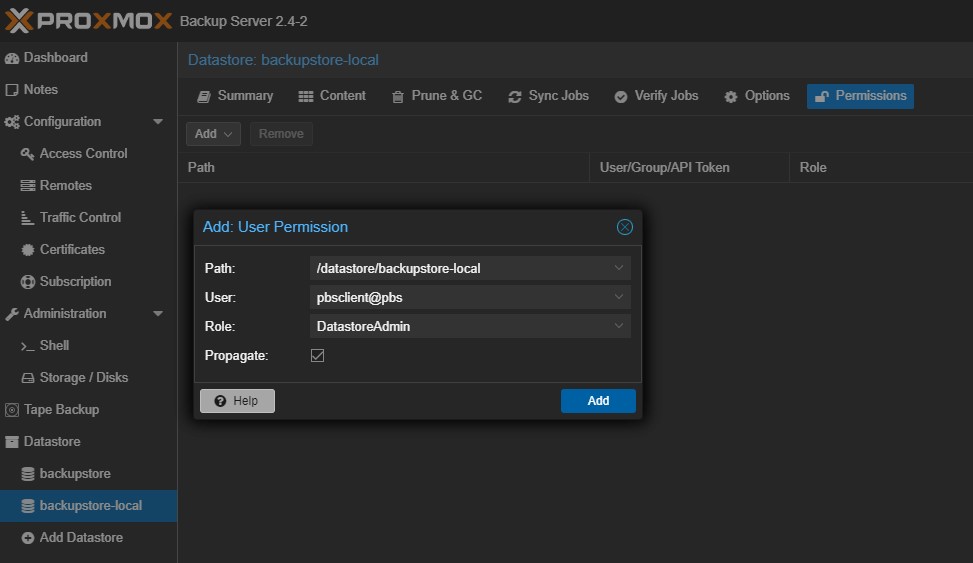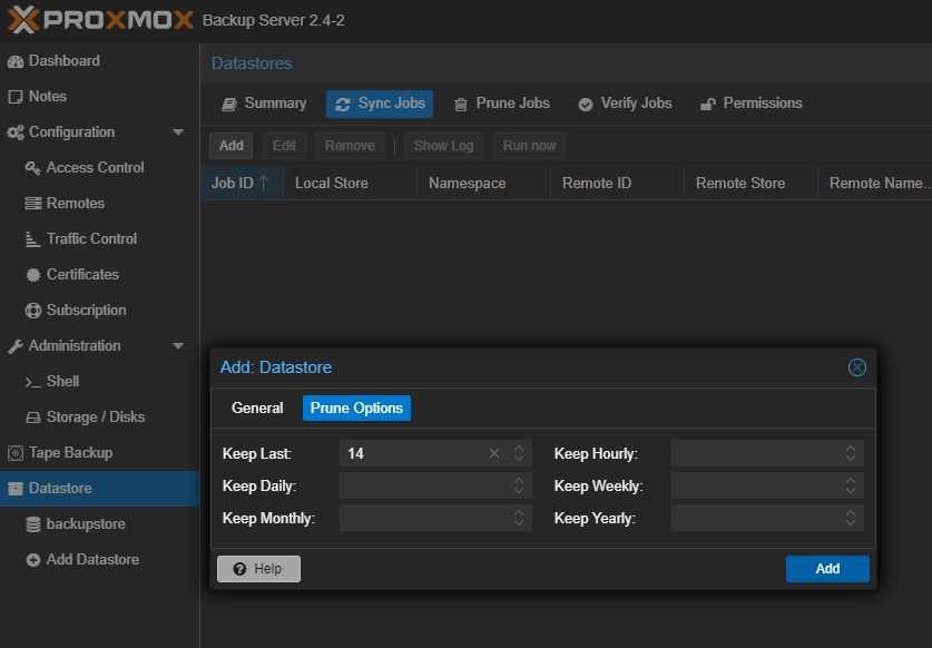 Wchodzimy w konsolę GUI PBS-a w menu Datastore – Add Datastore i dodajemy nasz punkt montowania /mnt/backupstore-local/ jako nowy Datastore o nazwie backupstore-local. Możemy od razu wybrać odpowiednie opcje Prune Options, w tym przypadku na tym Datastore będzie trzymane nie więcej niż 14 backupów danej maszyny wirtualnej Proxmox. Na koniec należy jeszcze dodać uprawnienia do nowego Datastore dla poprzednio założonego użytkownika pbsclient najlepiej jako DatastoreAdmin. Więcej o administracji użytkownikami PBS można znaleźć na stronie https://pbs.proxmox.com/docs/user-management.html