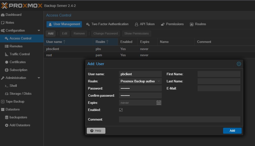 Nowy użytkownik o nazwie np. pbsclient posłuży do podłączenia storage z backupem PBS z poziomu konsoli Proxmox VE. Wchodzimy w menu Configuration – Access Control – Add