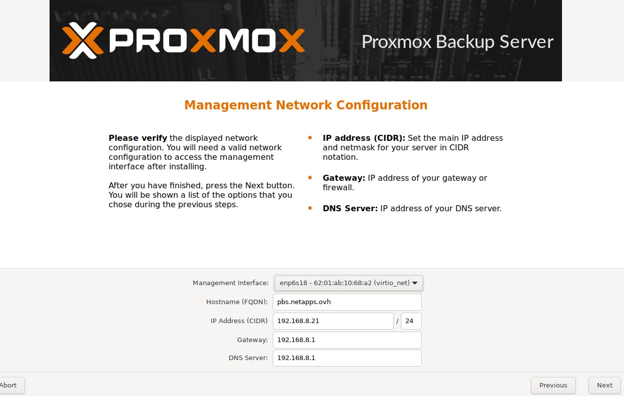 - Wybieramy w instalatorze dysk do instalacji, podajemy hasło root-a, definiujemy nazwę sieciową oraz statyczny adres ip np. 192.168.8.21 i pbs.netapps.ovh