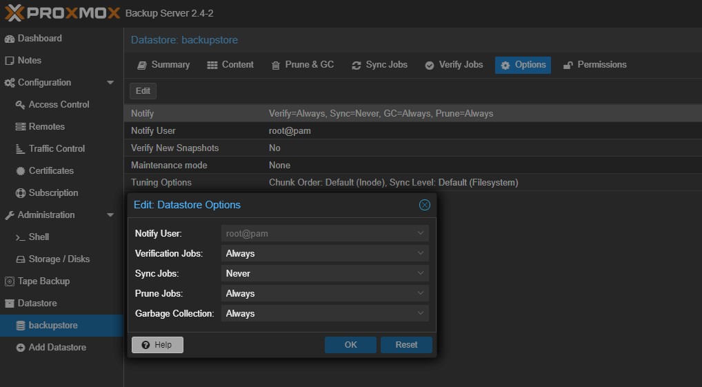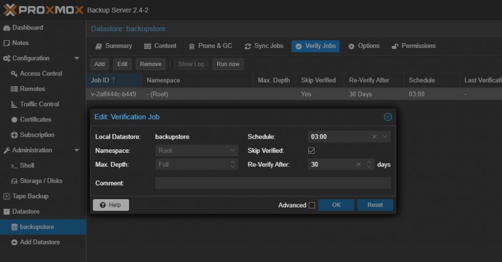 Na wybranym Datastore – Verify Jobs – Add. W tym przykładzie wyryfikacja jest codziennie o 3-ej rano po zakończeniu backupu startującego o 00:15. Dobrze jest na koniec ustawić w Options – Notify w jakim przypadku i kogo powiadamiać emailowo o weryfikacji, czyszczeniu, usuwaniu śmieci.