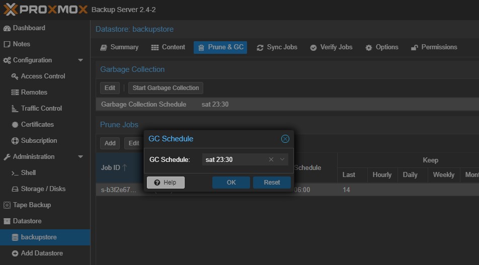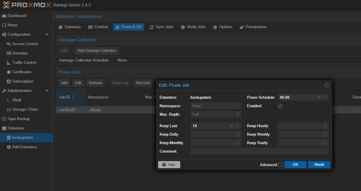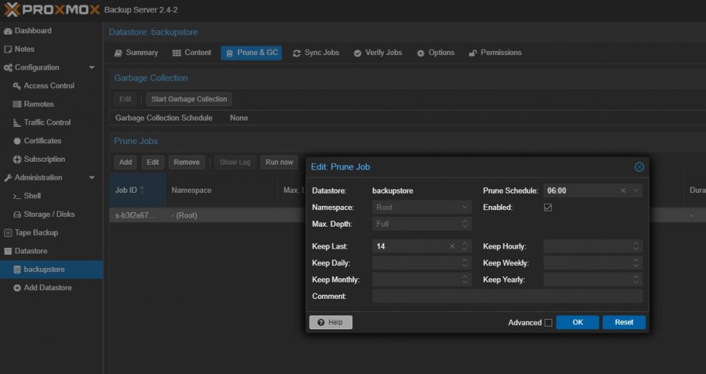 Zadania czyszczenia są skonfigurowane do okresowego czyszczenia magazynu danych lub jego podzbioru. Możesz zarządzać zadaniami przycinania w interfejsie internetowym, z karty Przycinanie i GC panelu Datastore lub z samego Datastore. Alternatywnie możesz nimi zarządzać za pomocą polecenia proxmox-backup-manager prune-job. Informacje o konfiguracji zadań przycinania są przechowywane w pliku /etc/proxmox-backup/prune.cfg. Aby utworzyć nowe zadanie przycinania, kliknij przycisk dodawania w graficznym interfejsie użytkownika lub użyj podrzędnego polecenia tworzenia w interfejsie wiersza polecenia menedżera. Po utworzeniu zadania przycinania możesz uruchomić je ręcznie z interfejsu GUI lub ustawić harmonogram , aby był uruchamiany regularnie jak w tym przypadku codziennie o 6-ej rano.
