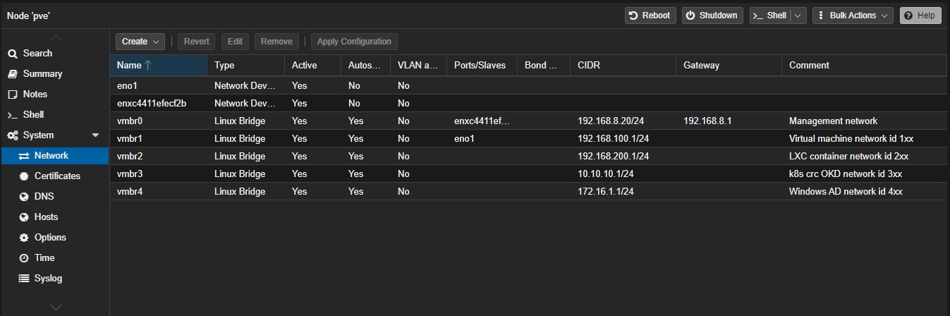 - 10.10.10.1/24 to sieć dla klastra K8sm, OKD oraz CRC podpięta do mostka vmbr3