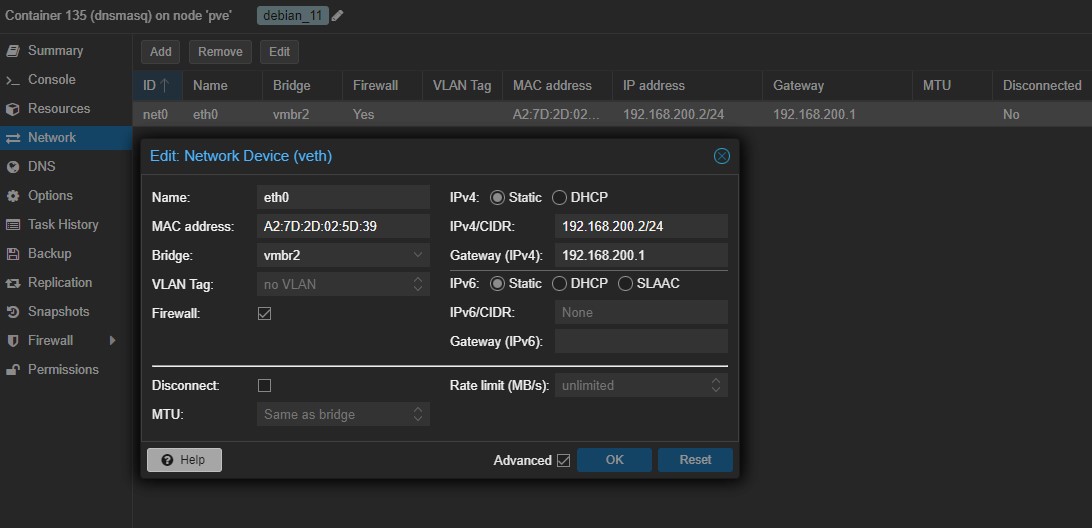 Tworzymy na szybko kontener LXC 1 vCPU / 256 MB RAM / 2 GB HDD np. w oparciu o szablon debian-11-standard_11.6-1 z następującymi ustawieniami sieciowymi