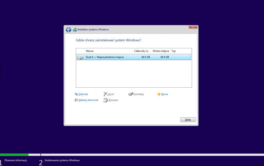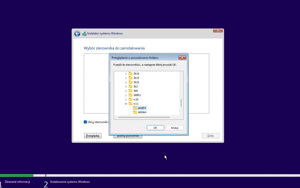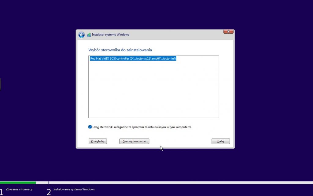 Na ekranie z pustym polem wyboru dysku do instalacji należy wcisnąć przycisk [ Load driver ] i wskazać sterownik w ścieżce D:\viostor\w11\amd64\. Następnie po znalezieniu dysku twardego wskazać go do instalacji systemu.