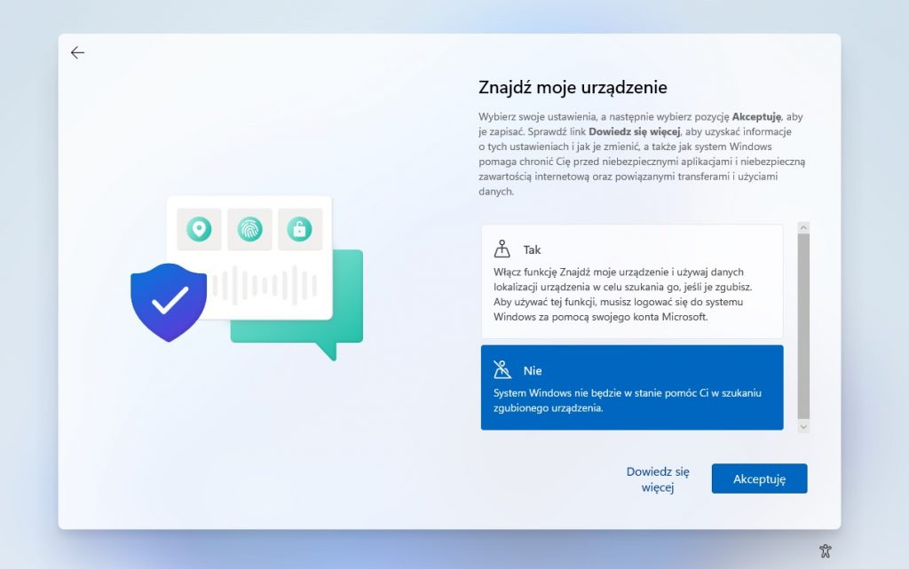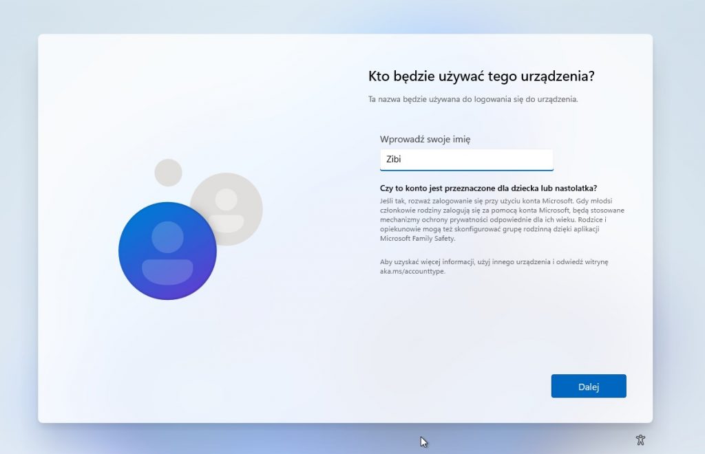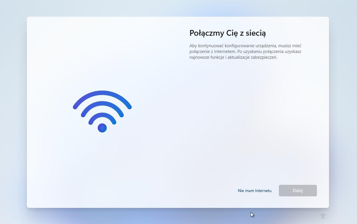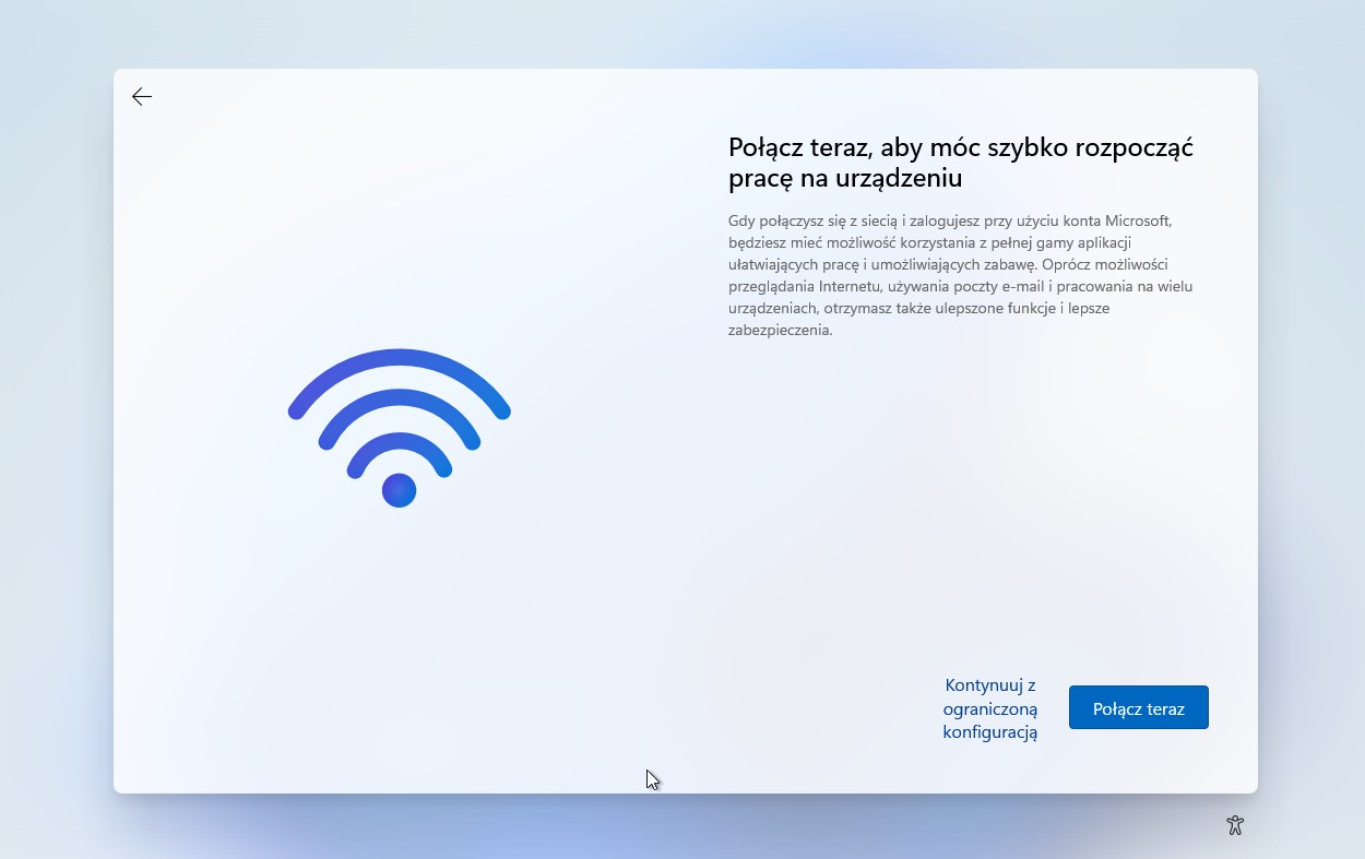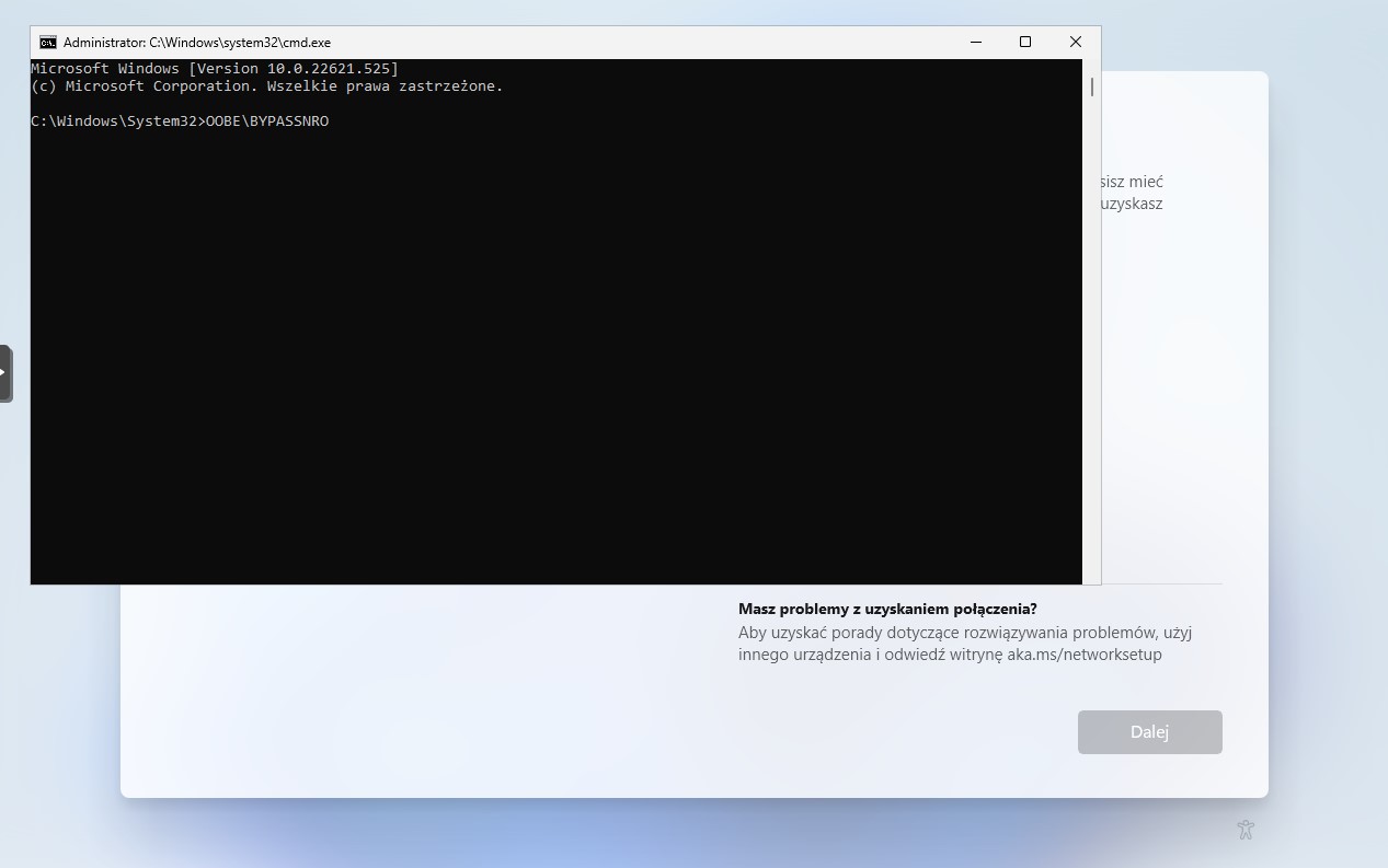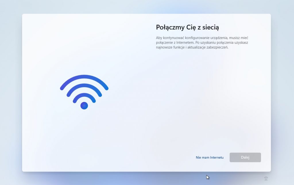 Na ekranie informującym o braku połączenia sieciowego wciskamy SHIFT+F10 i wpisujemy w oknie: OOBE\BYPASSNRO. Pozostałe opcje wybieramy najlepiej tak jak na zrzutach ekranu.