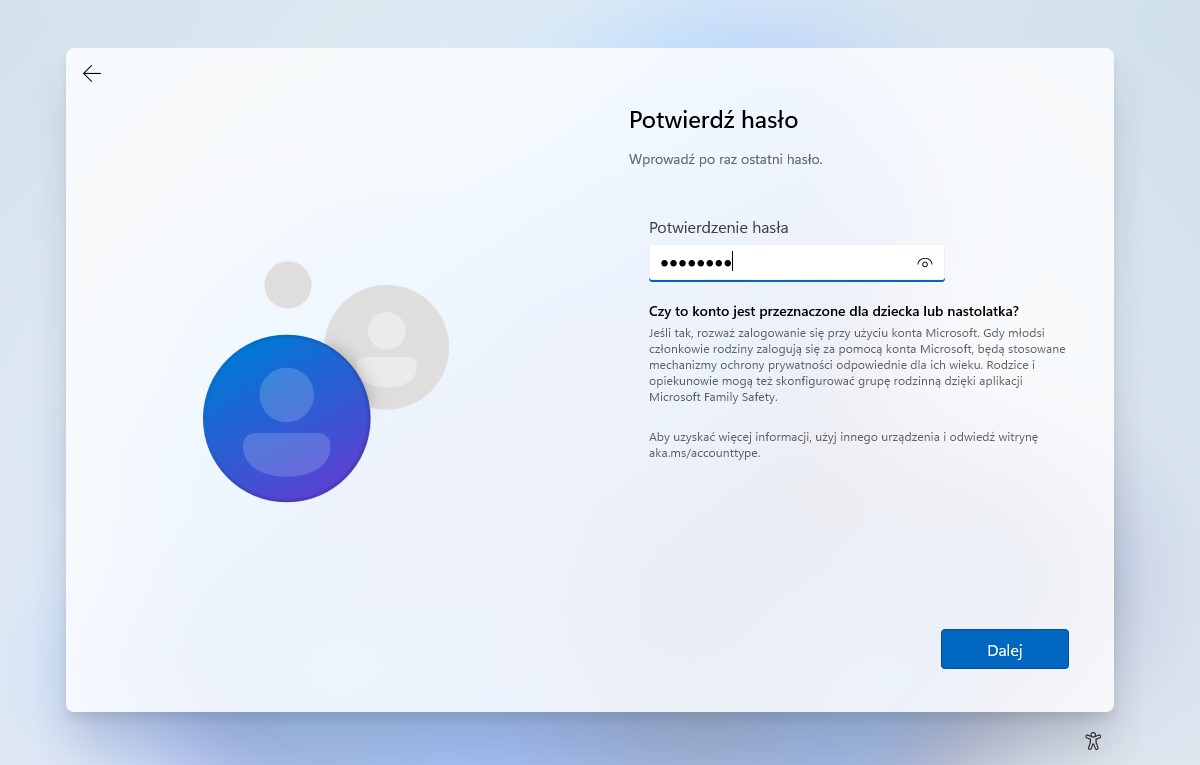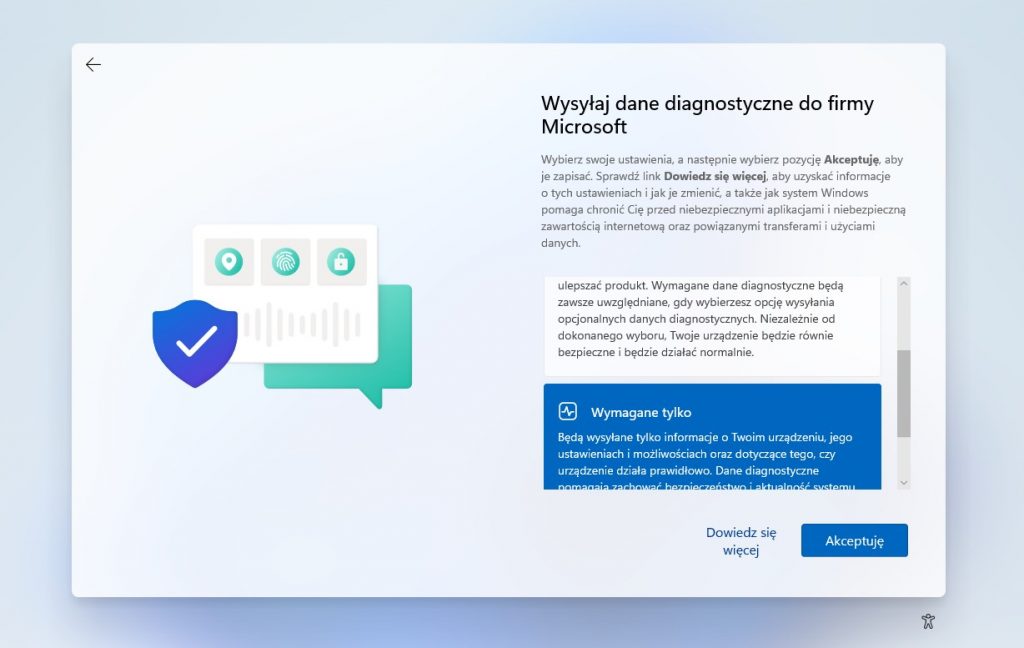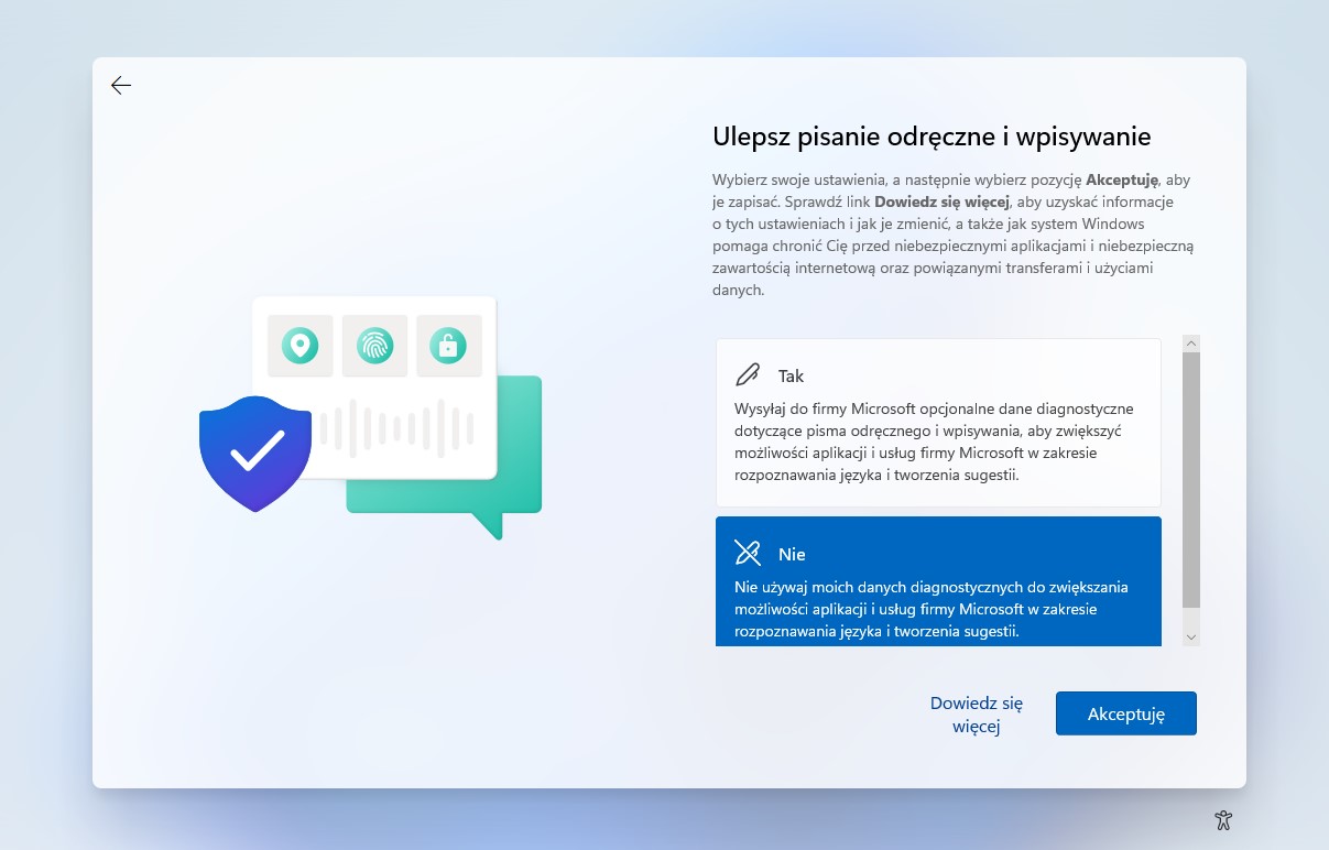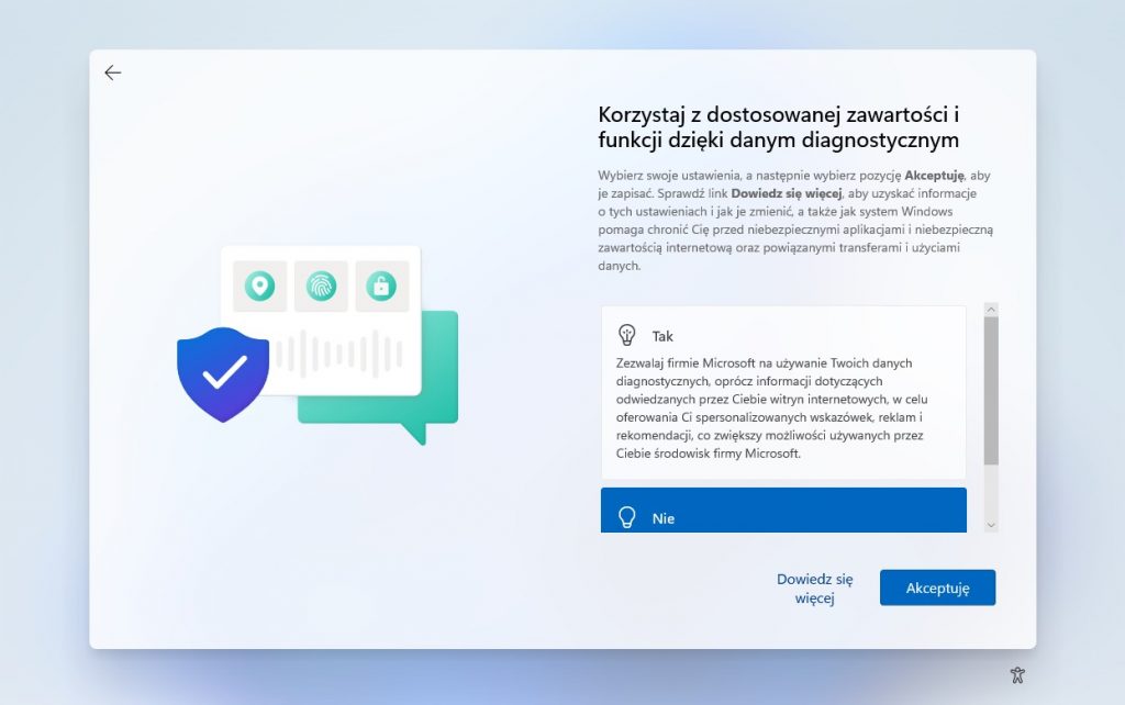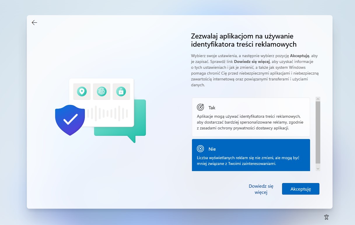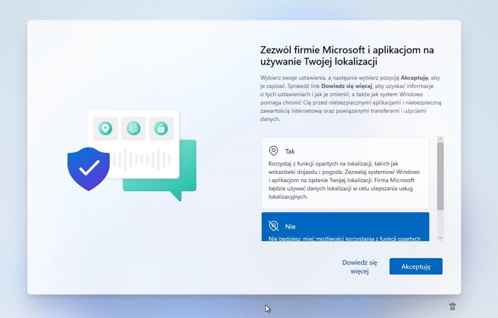 Na ekranie informującym o braku połączenia sieciowego wciskamy SHIFT+F10 i wpisujemy w oknie: OOBE\BYPASSNRO. Pozostałe opcje wybieramy najlepiej tak jak na zrzutach ekranu.