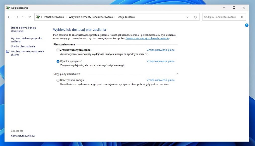 Ustawienie planu zasilania Windows 11 maksymalna wydajność