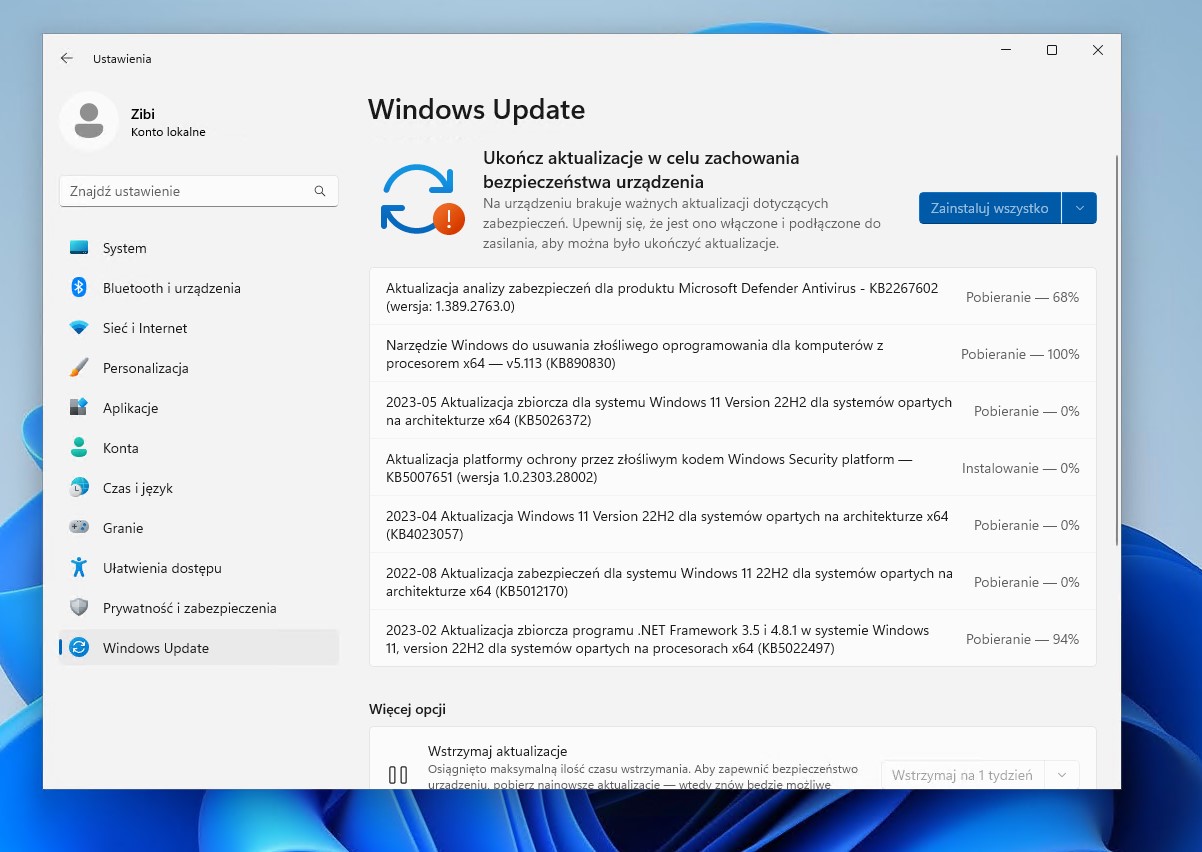 Koniecznie po skończonej instalacji sterowników VirtIO powinniśmy zaktualizować system Windows 11 w menu Ustawienia – Windows Update