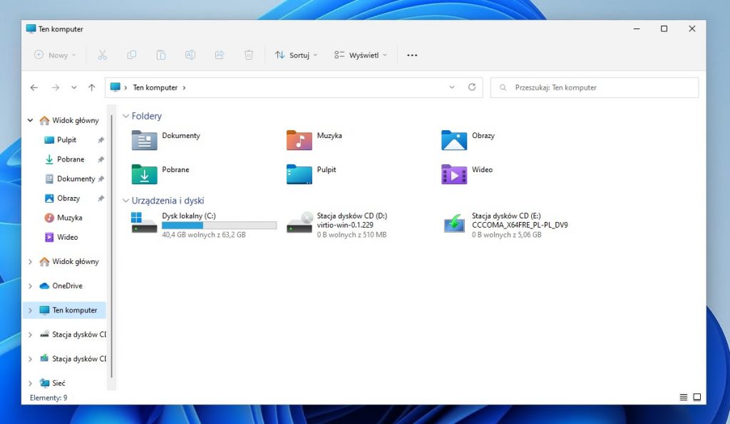 Po skończonej instalacji można już usunąć obrazy ISO z Windows 11 i VirtIO z zasobów sprzętowych maszyny wirtualnej.